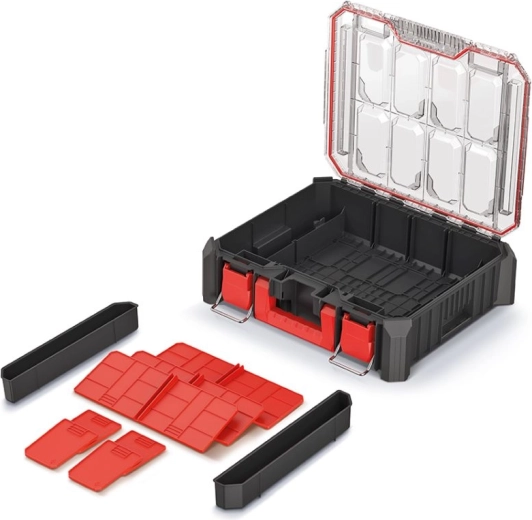 Un agencement intérieur astucieux avec 2 bacs séparés et 7 compartiments amovibles facilite l’organisation des vis, chevilles, forets et petits accessoires. Un joint de qualité empêche l’intrusion de poussière et d’eau, protégeant ainsi les objets stockés. Des charnières métalliques et des clips ABS solides maintiennent le couvercle bien fermé, et la poignée ergonomique assure un transport confortable.