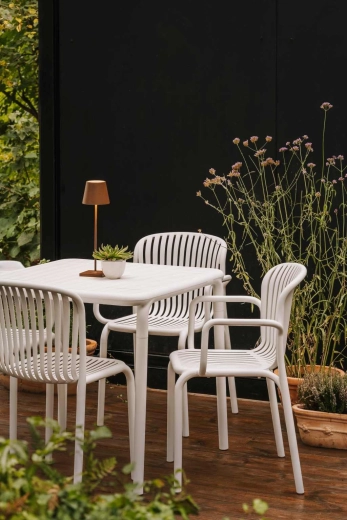 Avec un poids de 3,85 kg, la manipulation est aisée et l’empilage fait gagner de la place lors du stockage – idéal pour les terrasses, les cafés et les foyers.