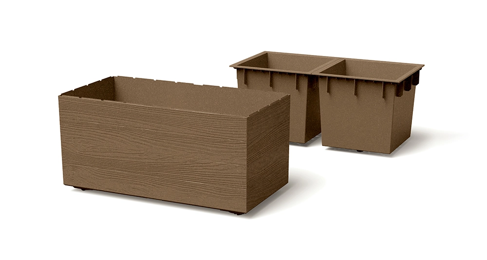 Des parois en plastique robustes avec une texture bois réaliste et des pieds surélevés assurent stabilité, durabilité et élégance.