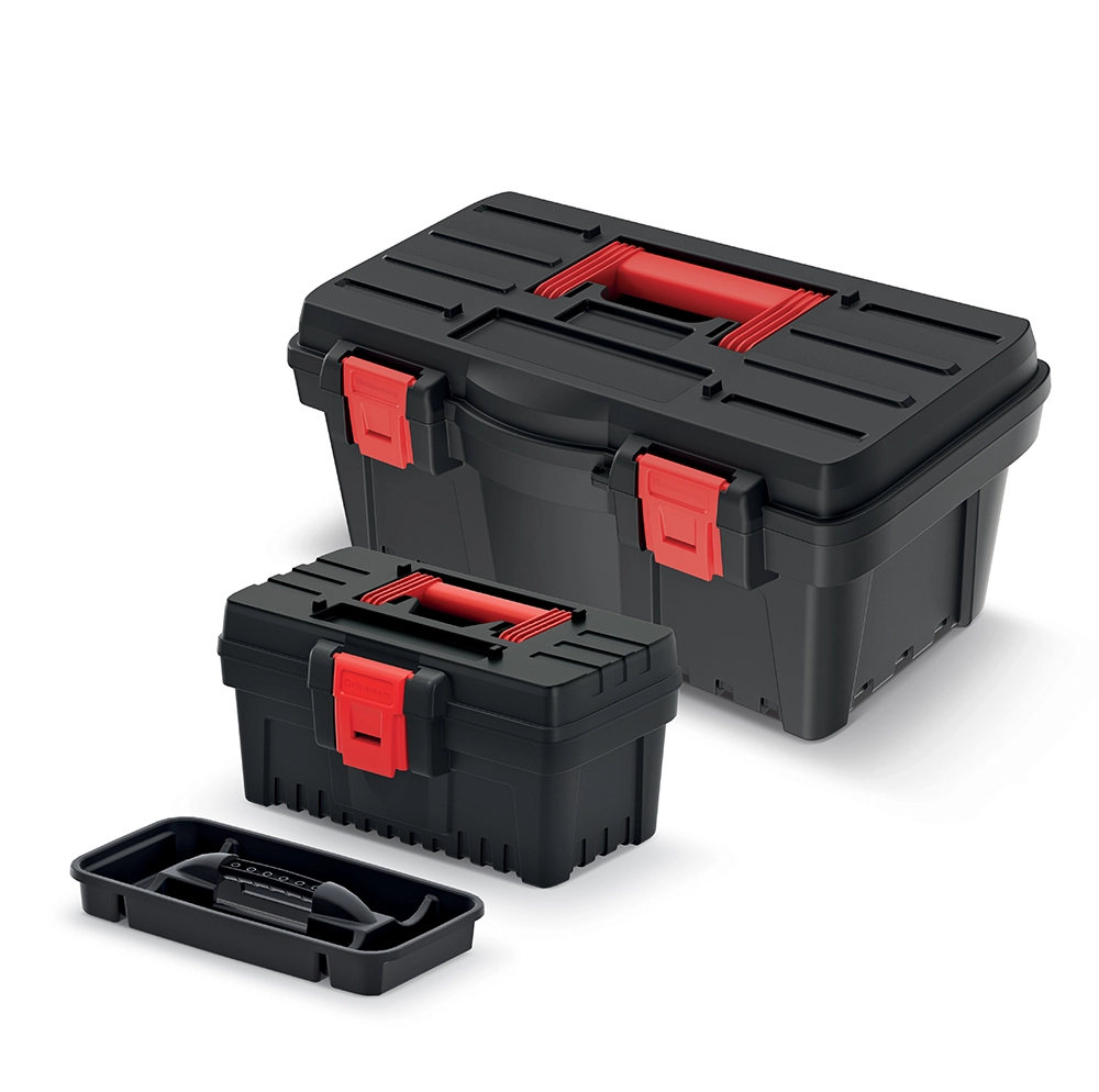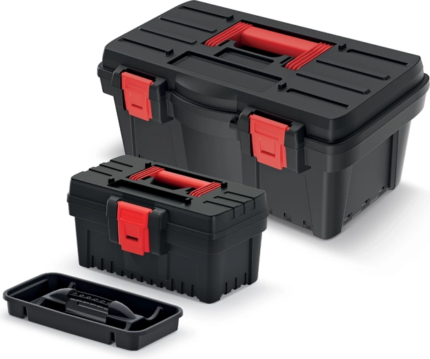 Le set Prosperplast DARK 50 + DARK 30 combine capacité et dimensions compactes dans un seul ensemble. La valise la plus grande, de 47,6 × 25,8 × 22,6 cm avec une capacité de charge de 12 kg, accueille les outils manuels, tandis que la plus petite, 26,9 × 17,7 × 15,5 cm avec une charge maximale de 10 kg, est idéale pour les vis, embouts et accessoires. Le plastique robuste protège le contenu contre les dommages et la finition noire (code couleur S411) confère un aspect professionnel.