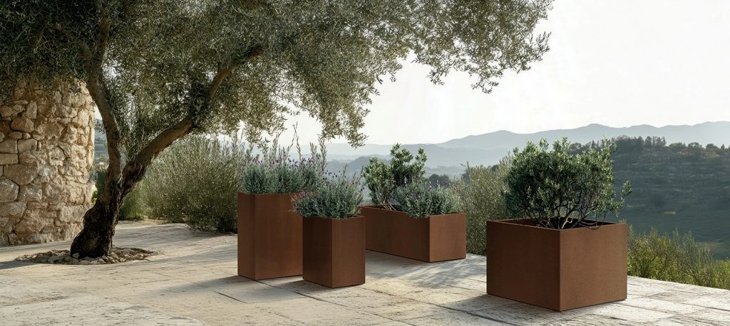 - Look moderne : lignes épurées, forme carrée et brun rouille rustique