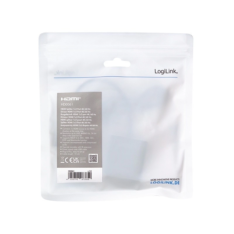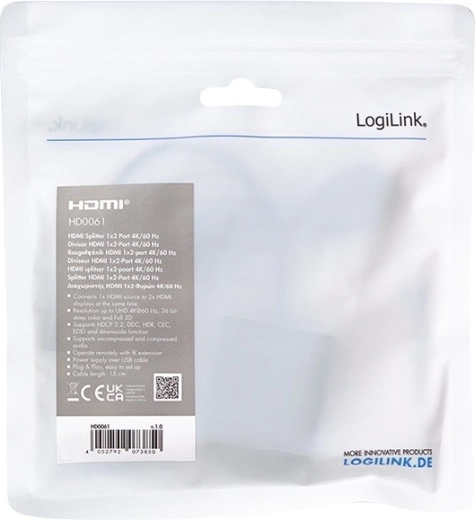 Le répartiteur HDMI de la marque LogiLink divise le signal d’une seule source vers deux écrans en qualité 4K UHD à 60 Hz. Plus besoin de rebrancher les câbles – idéal pour les présentations, showrooms, magasins, restaurants et le home cinéma. Grâce à la prise en charge de l’interface IR, vous pouvez contrôler le splitter et le téléviseur à l’aide d’une télécommande (en option).