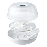 Le stérilisateur ne comporte que trois pièces, il se monte et se nettoie très facilement – après usage, il suffit de l’essuyer ou de le placer au lave-vaisselle. Il convient à la plupart des fours à micro-ondes standards avec un espace intérieur minimal de 187 mm (hauteur) × 280 mm (largeur et profondeur). Compatible avec les biberons et accessoires en matériaux adaptés au micro-ondes (les biberons en PA et les tétines en PA ne conviennent pas).