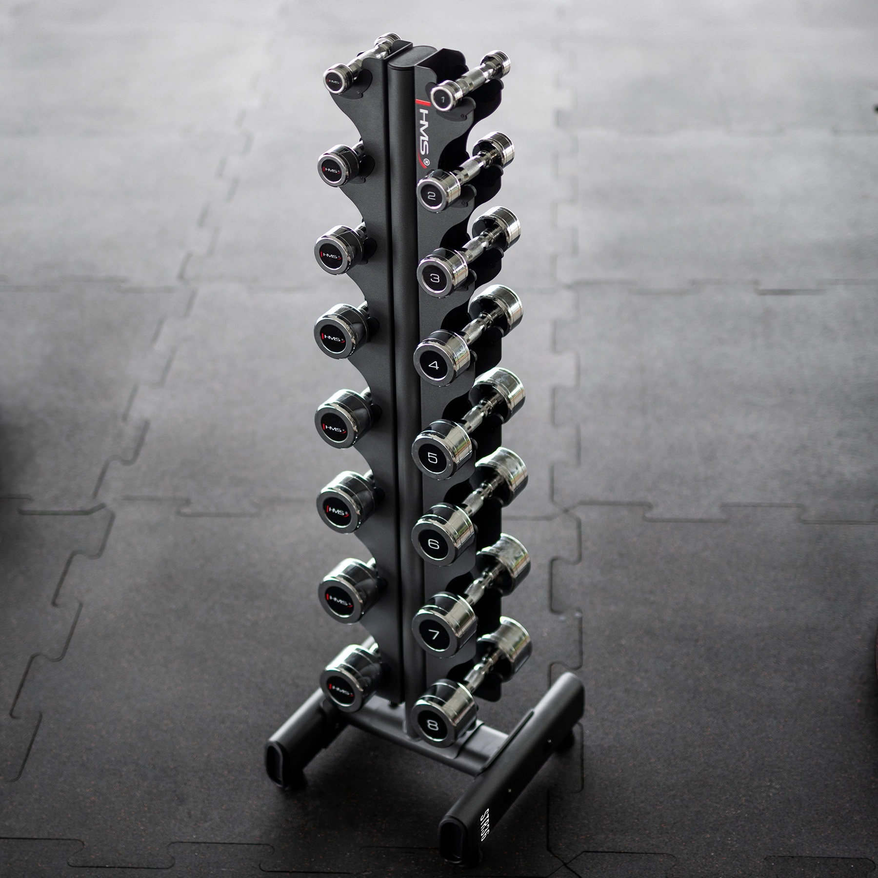 Support à haltères HMS compact et robuste pour 8 paires, idéal pour garder votre salle parfaitement organisée. Il offre une structure en acier stable, une capacité de charge de 75 kg et des patins antidérapants pour une utilisation sûre et confortable, même dans les petits espaces.