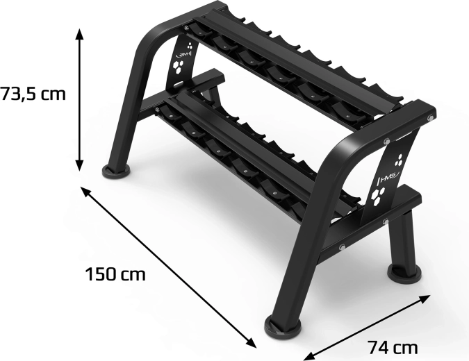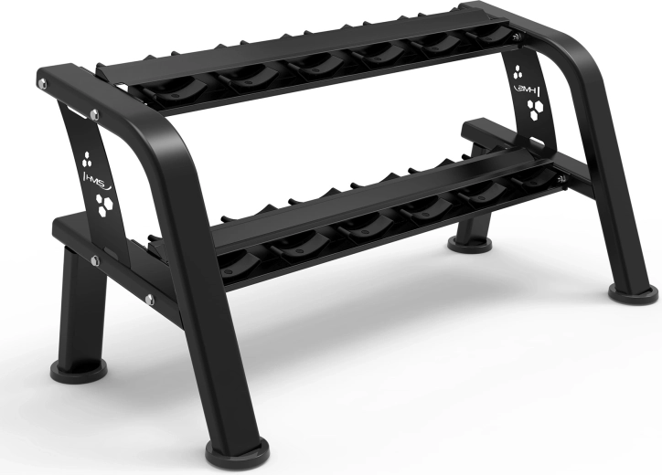 Le HMS STR48 est un support à deux niveaux conçu avec soin, assurant le rangement sécurisé de jusqu’à 12 haltères. Grâce aux étagères légèrement inclinées, la manipulation des haltères est plus confortable et ménage les poignets. La structure en acier lourd et la large base garantissent une grande stabilité même à pleine charge.
