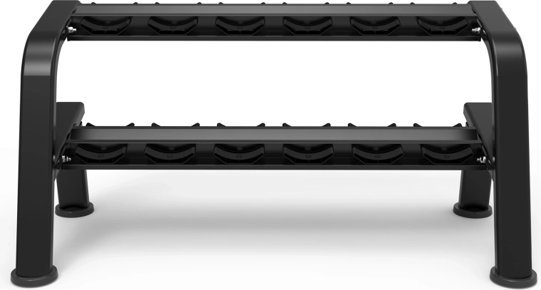 Deux larges étagères légèrement inclinées offrent un accès rapide et sûr à six paires d’haltères tout en économisant de la place dans votre salle d’entraînement.