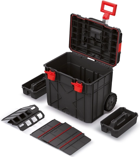 La poignée télescopique et les grandes roues robustes assurent un déplacement fluide même sur terrain irrégulier. La poignée confortable et le centre de gravité stable facilitent la manipulation de la boîte entièrement chargée.