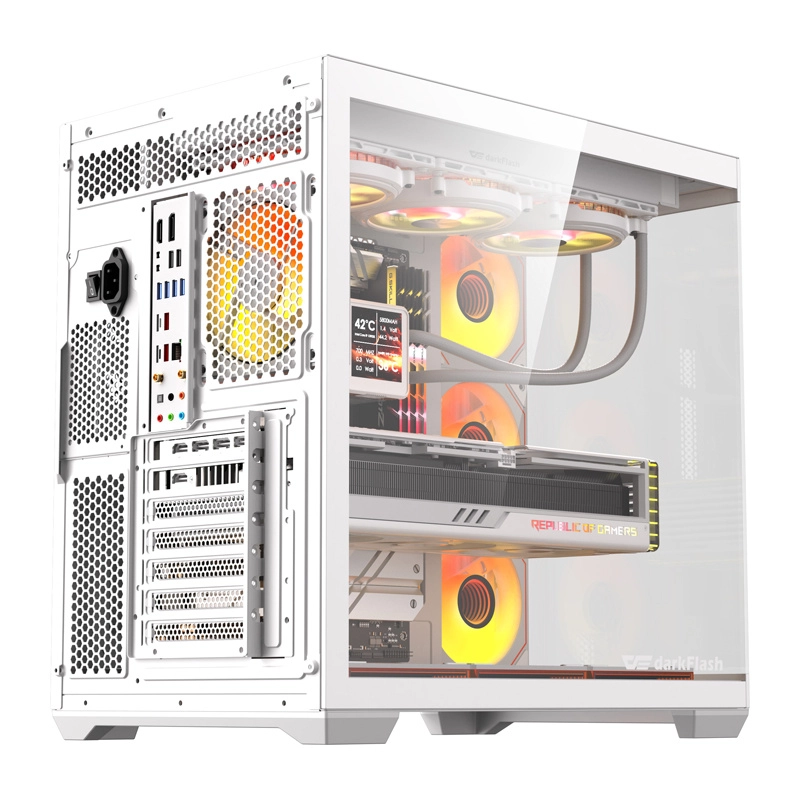 Le boîtier PC DarkFlash C280 blanc, stylé et spacieux, offre un design panoramique à 270° avec panneaux en verre trempé, la prise en charge des cartes mères jusqu’à l’E‑ATX et l’installation jusqu’à 10 ventilateurs ou de radiateurs AIO jusqu’à 360 mm. Le pack inclut déjà 7 ventilateurs 120 mm préinstallés pour un refroidissement efficace, un montage vertical du GPU, une excellente gestion des câbles et un panneau I/O pratique avec USB 3.0.