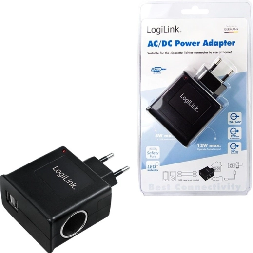 L’adaptateur LOGILINK vous permet d’utiliser à la maison, sur une prise murale, des appareils prévus pour l’allume-cigare. La prise 12 V intégrée (max. 1 A) convient aux petits accessoires automobiles, tandis que le port USB avec sortie 5 V/1 A recharge les appareils électroniques compacts. L’entrée universelle 100–240 V garantit une utilisation sans souci à domicile comme en voyage.