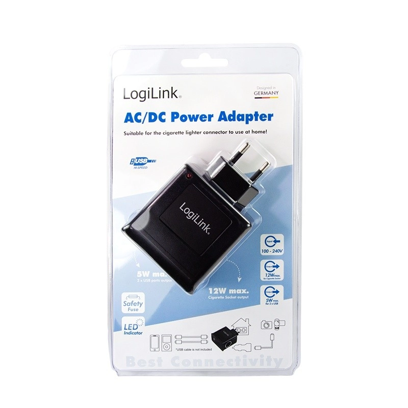 Adaptateur secteur pratique de LOGILINK pour alimenter les accessoires automobiles à la maison. Il offre une prise allume-cigare 12 V (max. 1 A) et une sortie USB 5 V/1 A. Grâce à l’entrée 100–240 V, à la protection contre les surtensions et les courts-circuits et à son format compact, il est idéal pour alimenter vos appareils en toute sécurité et commodité.