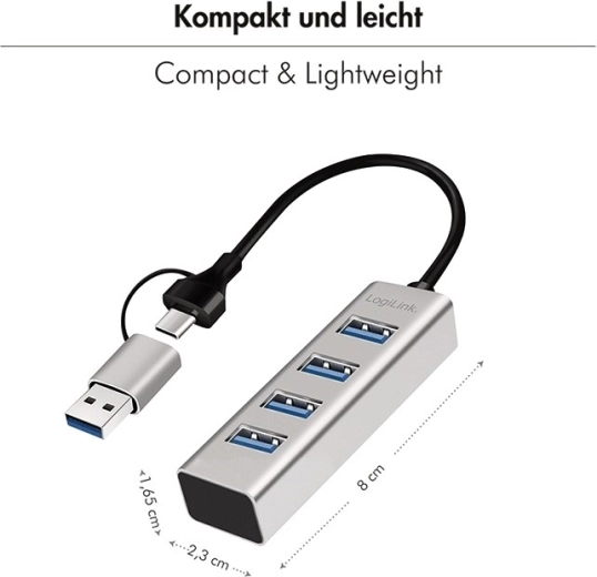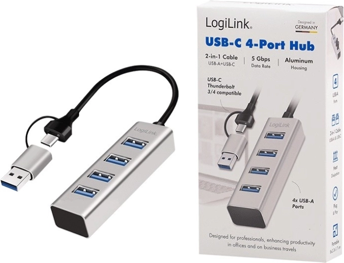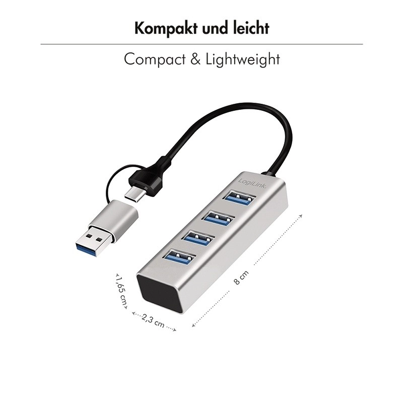 Grâce au câble 2‑en‑1 intégré avec connecteurs USB‑C et USB‑A, vous branchez le hub aux ordinateurs portables, téléphones et tablettes modernes comme aux PC plus anciens, sans adaptateurs supplémentaires. Son boîtier métallique compact est robuste et se glisse facilement dans un sac : parfait en déplacement comme sur le bureau.