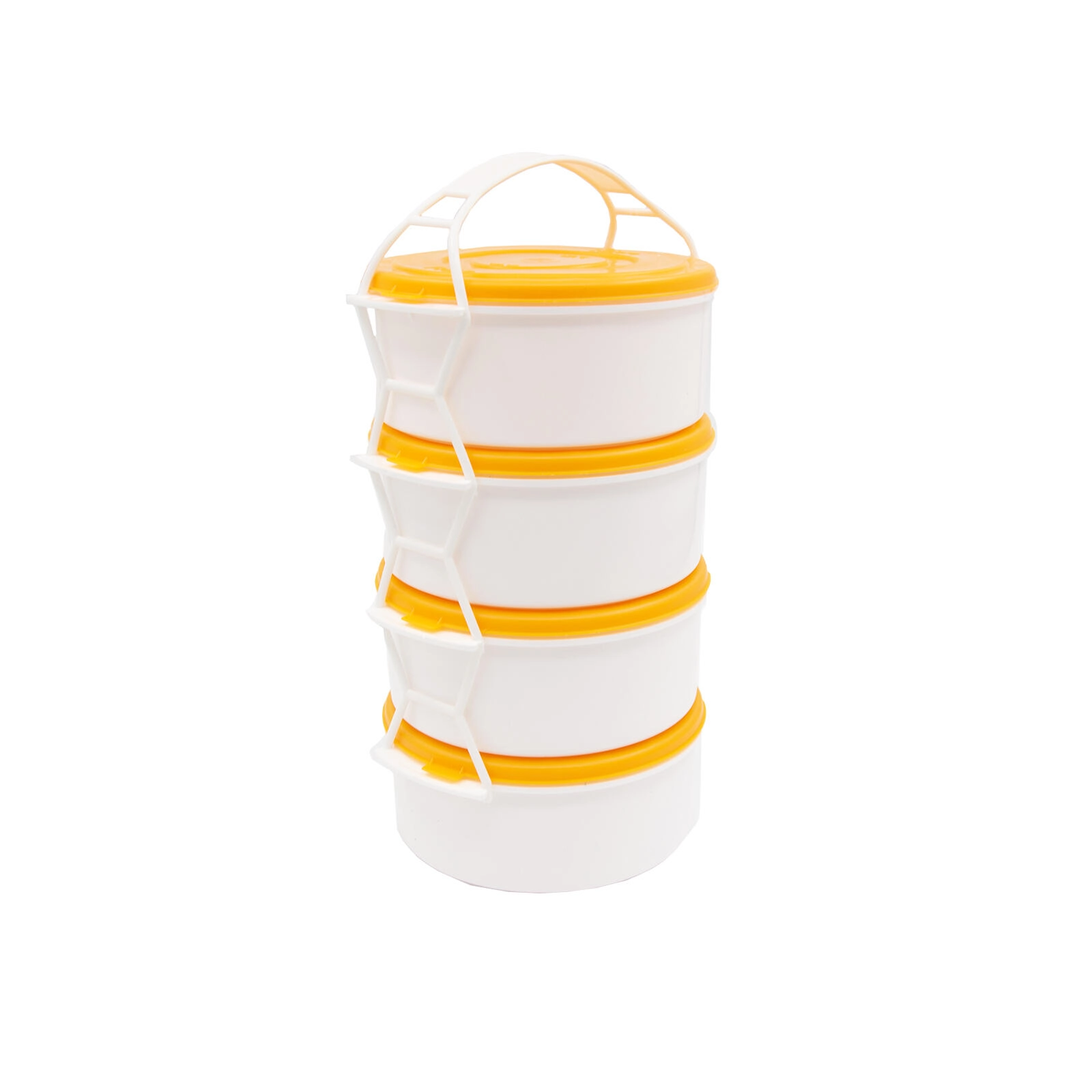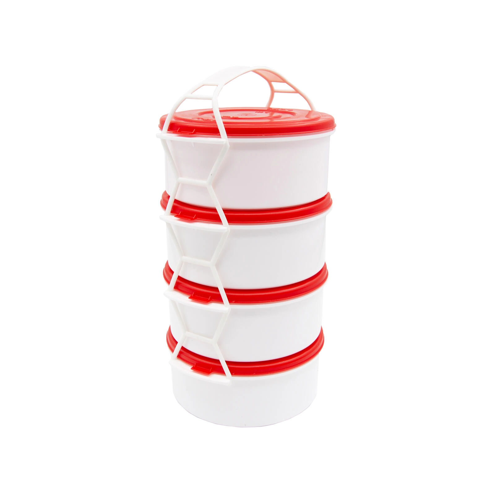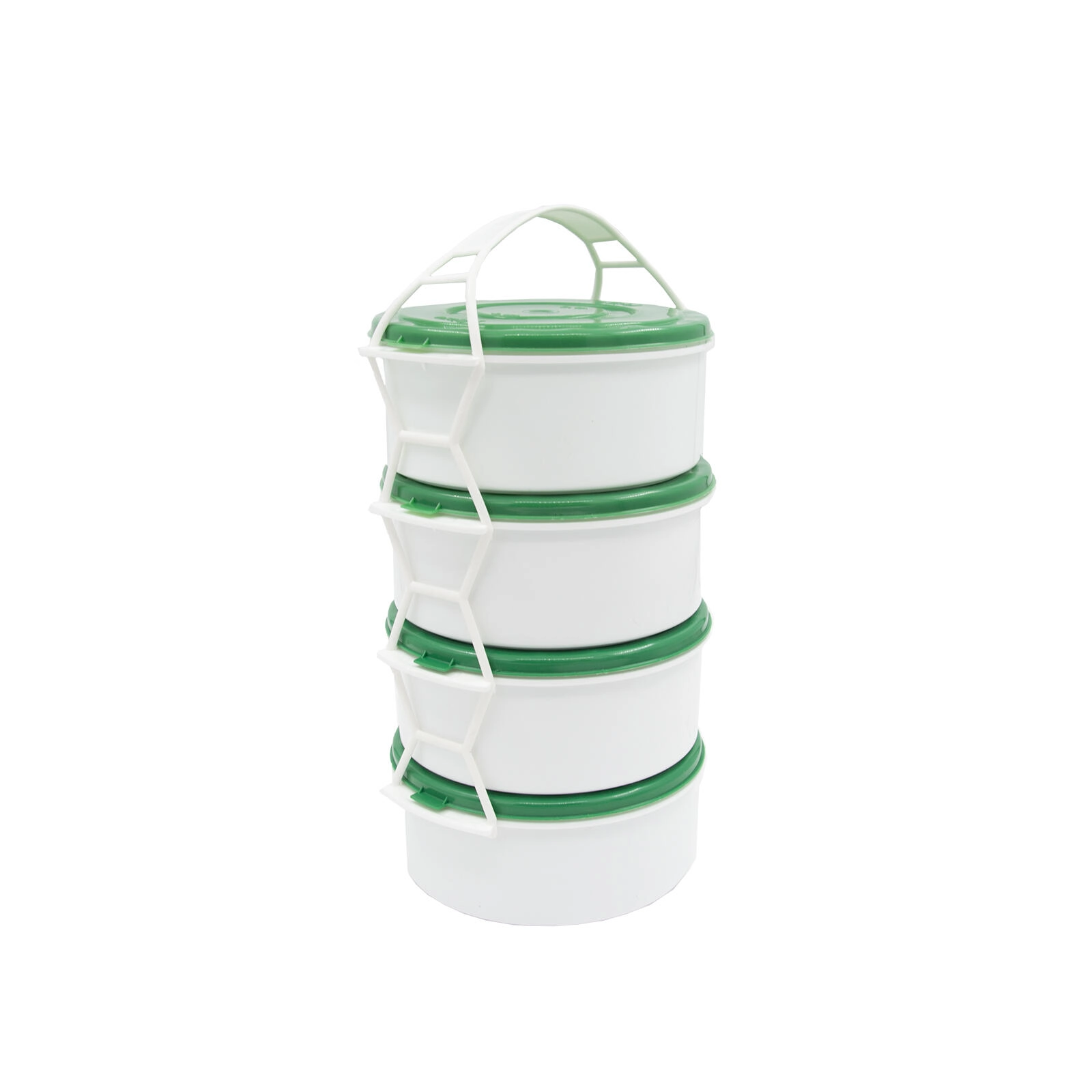 Le corps porteur blanc avec poignée relie fermement tous les contenants afin qu’ils restent en place pendant le transport.