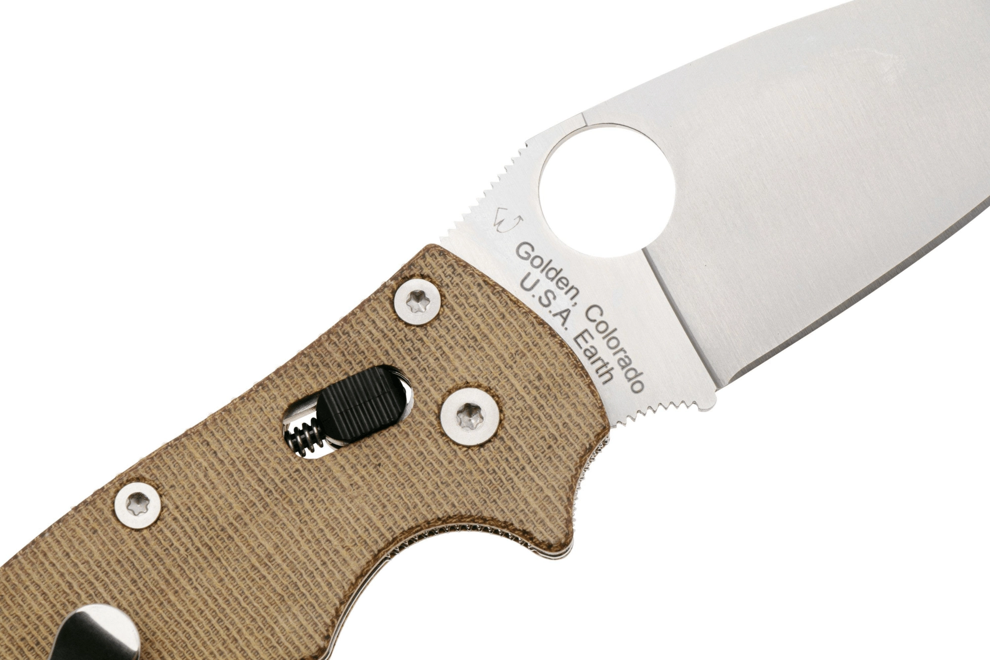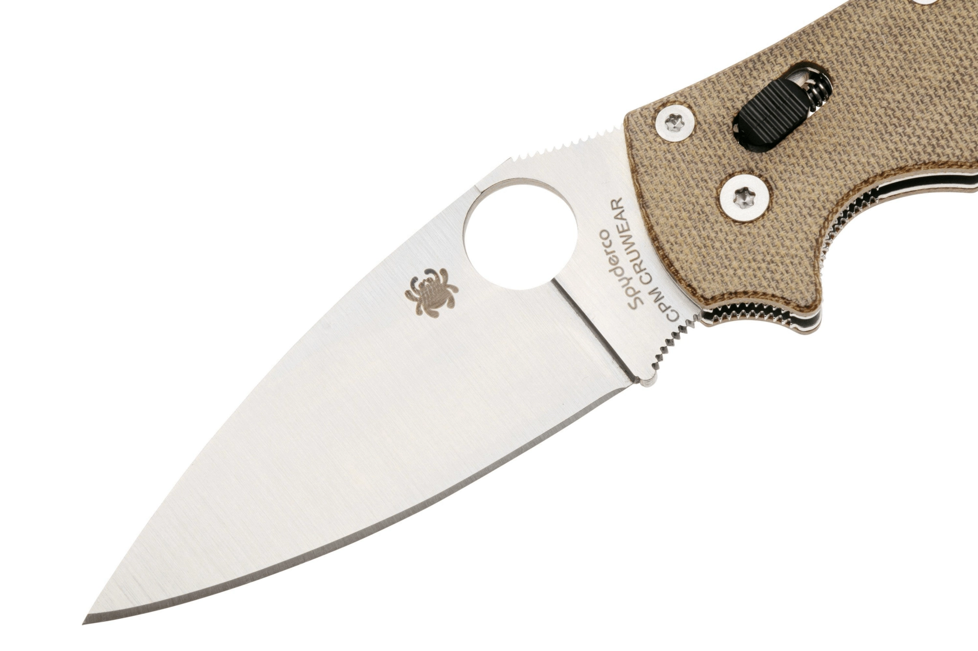 Le trou breveté SpyderHole permet une ouverture rapide et ambidextre, même avec des gants. Le verrou Spyderco Ball Bearing Lock, robuste et onctueux, procure une grande sécurité au travail et reste entièrement ambidextre. Le manche en Canvas Micarta brun est agréablement adhérent, léger et stylé ; le laminage textile apporte un look unique et de la solidité. Le clip de poche réversible convient au port droitier comme gaucher.