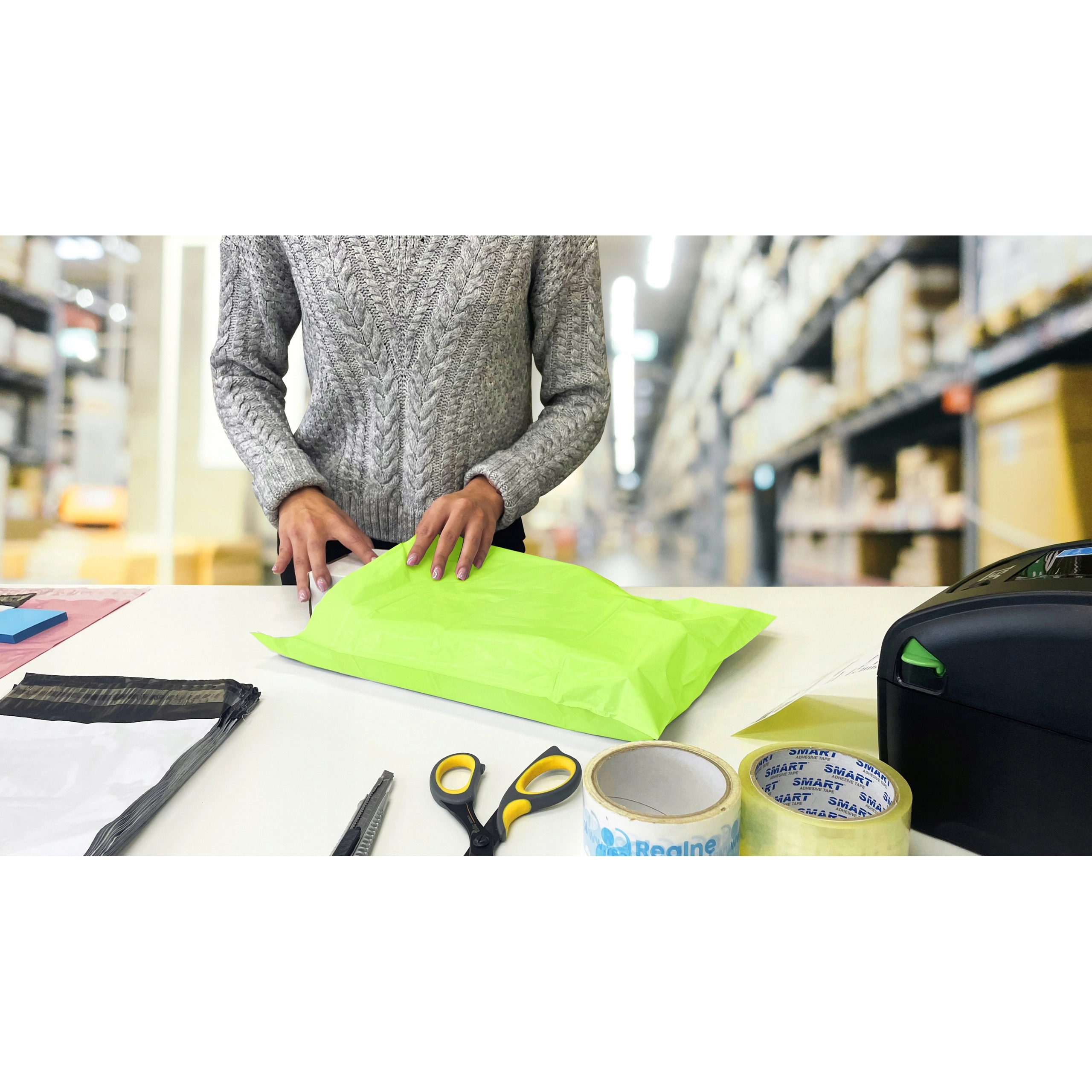 La bande autocollante permet un scellement immédiat et solide, sans ciseaux ni ruban. Accélérez l’expédition et réduisez les erreurs lors de l’emballage.