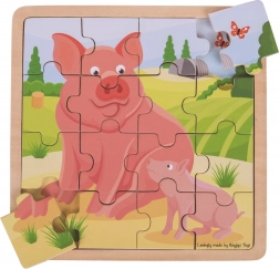 La première promenade d’une truie avec son porcelet illustrée sur une image attendrissante séduira les enfants au premier regard. Le puzzle de 16 pièces est inséré dans un cadre avec motif de fond, ce qui aide les petits débutants à s’orienter rapidement et à profiter de la joie de réussir. Les pièces sont suffisamment grandes et agréables à manipuler pour les petites mains.