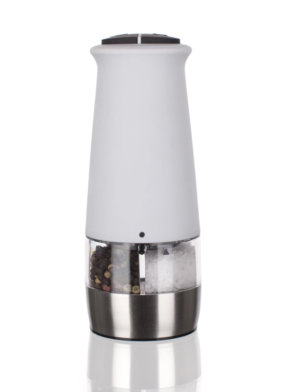 Pratique, le moulin électrique 2‑en‑1 pour le sel et le poivre, en élégant blanc, fait gagner du temps et de l’effort. Grâce à son système de broyage en céramique et à la mouture réglable, vous adaptez facilement l’assaisonnement à votre goût. Commande à une main et fenêtre transparente pour contrôler le niveau: l’accessoire idéal pour toute cuisine.