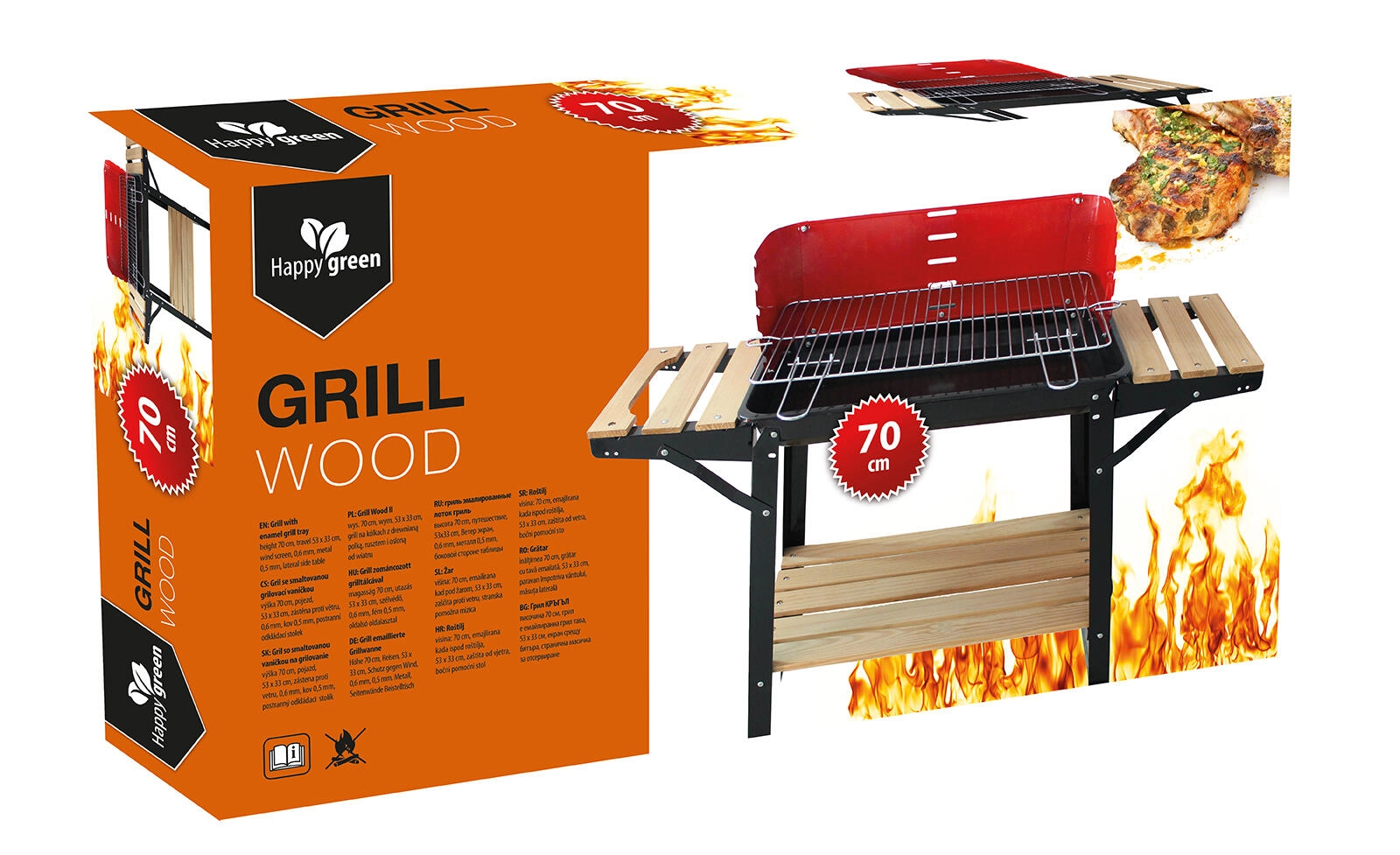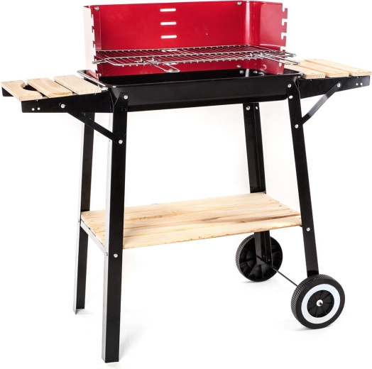 Un équipement pratique, incluant un pare-vent, améliore le tirage et la stabilité de la chaleur. Les deux tablettes latérales offrent suffisamment de place pour les ustensiles et les ingrédients, et l’étagère inférieure en bois est parfaite pour ranger le charbon ou les accessoires de service. Grâce à sa conception bien pensée, le barbecue convient au balcon, à la terrasse et au jardin.