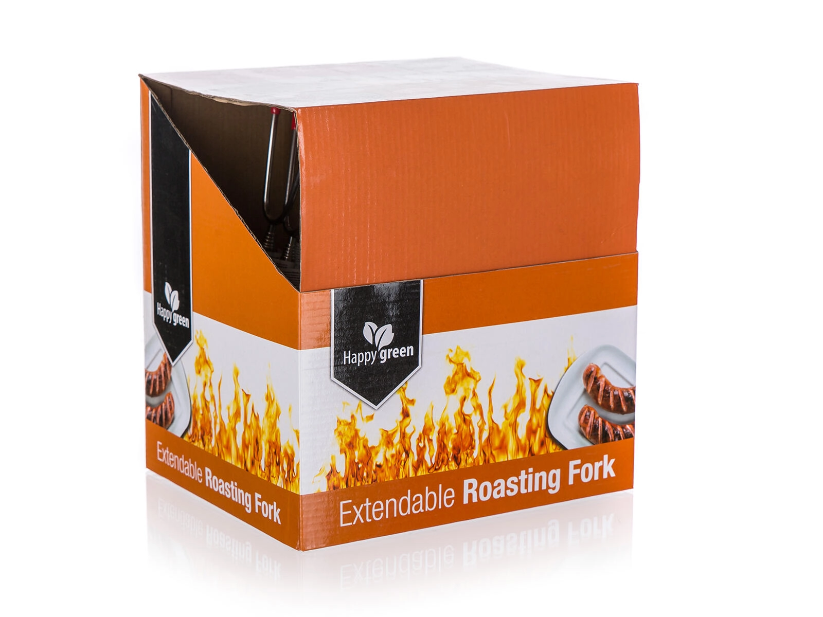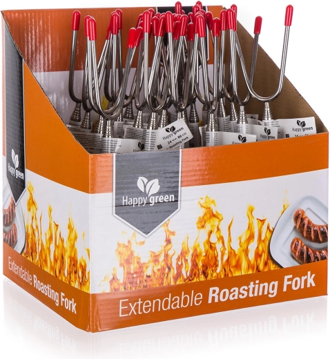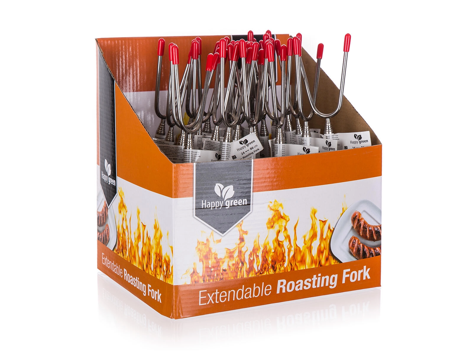 Pratique fourchette télescopique pour grillade avec longueur réglable 24–86 cm, en acier inoxydable et poignée en PVC confortable. Idéale pour griller des saucisses, knackis et légumes au feu de bois ou sur le gril, avec deux pointes robustes pour un piquage sûr.