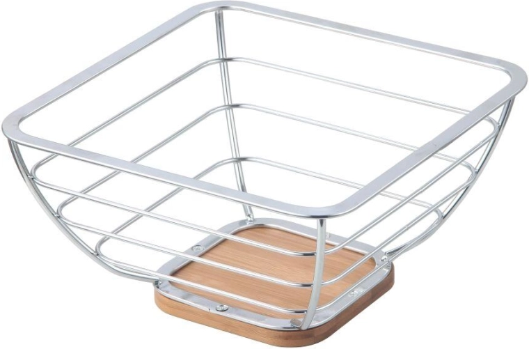 Élégante corbeille à fruits alliant chrome brillant et bambou naturel, parfaite pour le service comme pour un accessoire déco stylé. Grâce à sa base carrée en bambou solide, elle offre une meilleure stabilité et un rangement sûr des fruits.