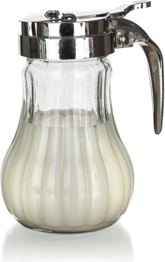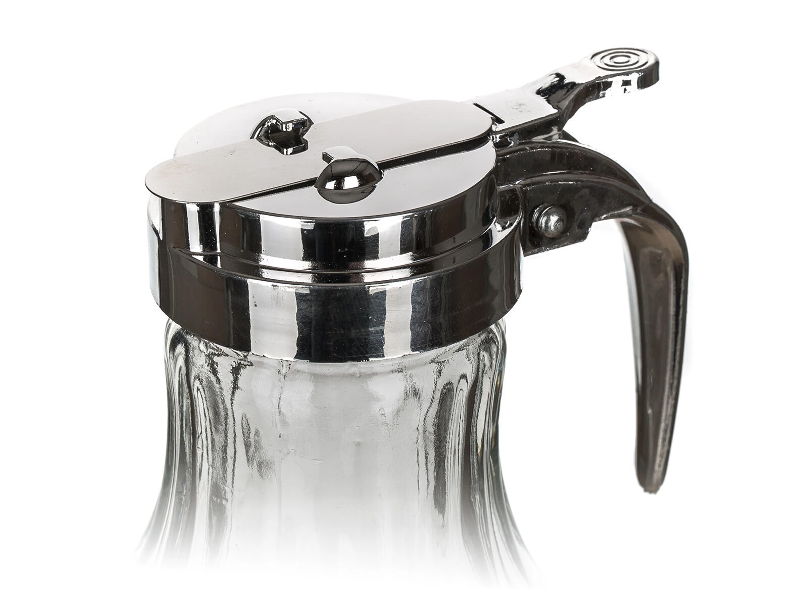 Le couvercle à charnière avec levier permet un débit contrôlé sans gouttes – idéal pour le miel, la crème et les sirops.