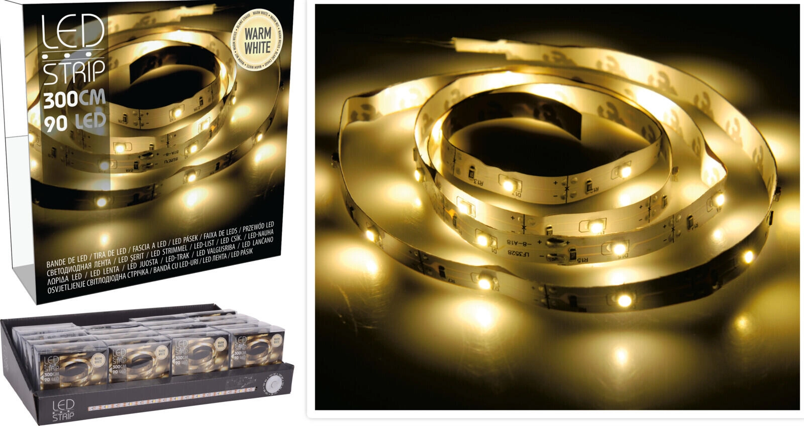 Ruban lumineux LED universel d’une longueur de 3 m avec 90 LED dans une agréable teinte blanc chaud. Idéal pour la décoration, l’éclairage d’accent et les ornements saisonniers. Alimentation par 3× piles AA pour une installation facile sans prise secteur.