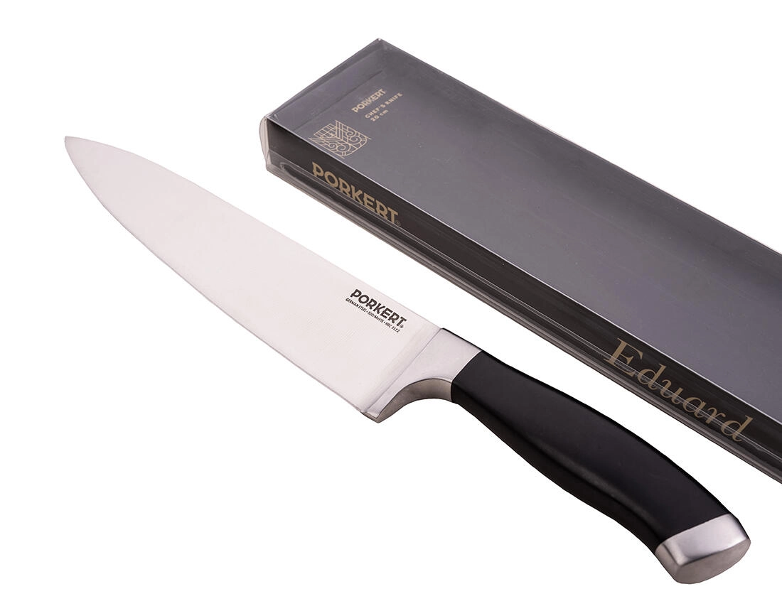 Le couteau de chef EDUARD 20 cm est un outil essentiel pour quiconque veut travailler en cuisine rapidement, avec précision et en toute sécurité. Sa construction équilibrée, la forme universelle de sa lame et des matériaux de qualité assurent une coupe fluide des légumes, de la viande et des herbes.