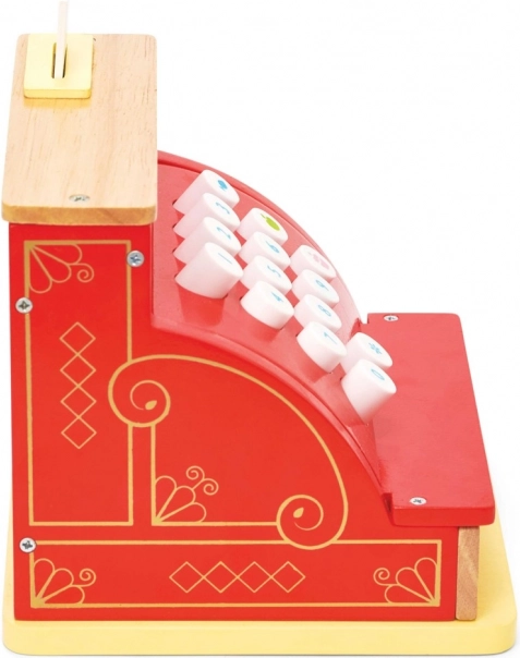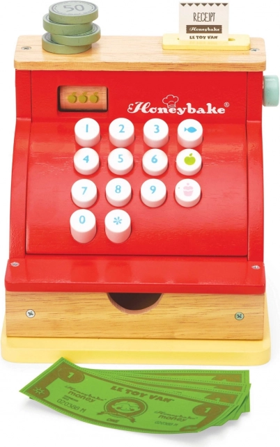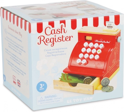 La caisse enregistreuse en bois rouge LE TOY VAN de la collection primée Honeybake allie une fabrication de qualité, des matériaux sûrs et un charme vintage rehaussé de détails dorés. Idéale pour jouer au magasin et développer les compétences sociales, la créativité et les bases des mathématiques.