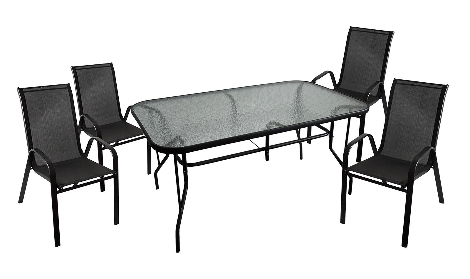 Élégant ensemble de jardin pour quatre personnes alliant une structure en acier durable, un verre trempé à texture décorative et un textilène respirant pour un confort maximal. La table spacieuse de 150 × 90 cm offre suffisamment de place pour les repas en famille comme pour les moments conviviaux entre amis, les chaises sont empilables et l’ensemble est facile à entretenir.