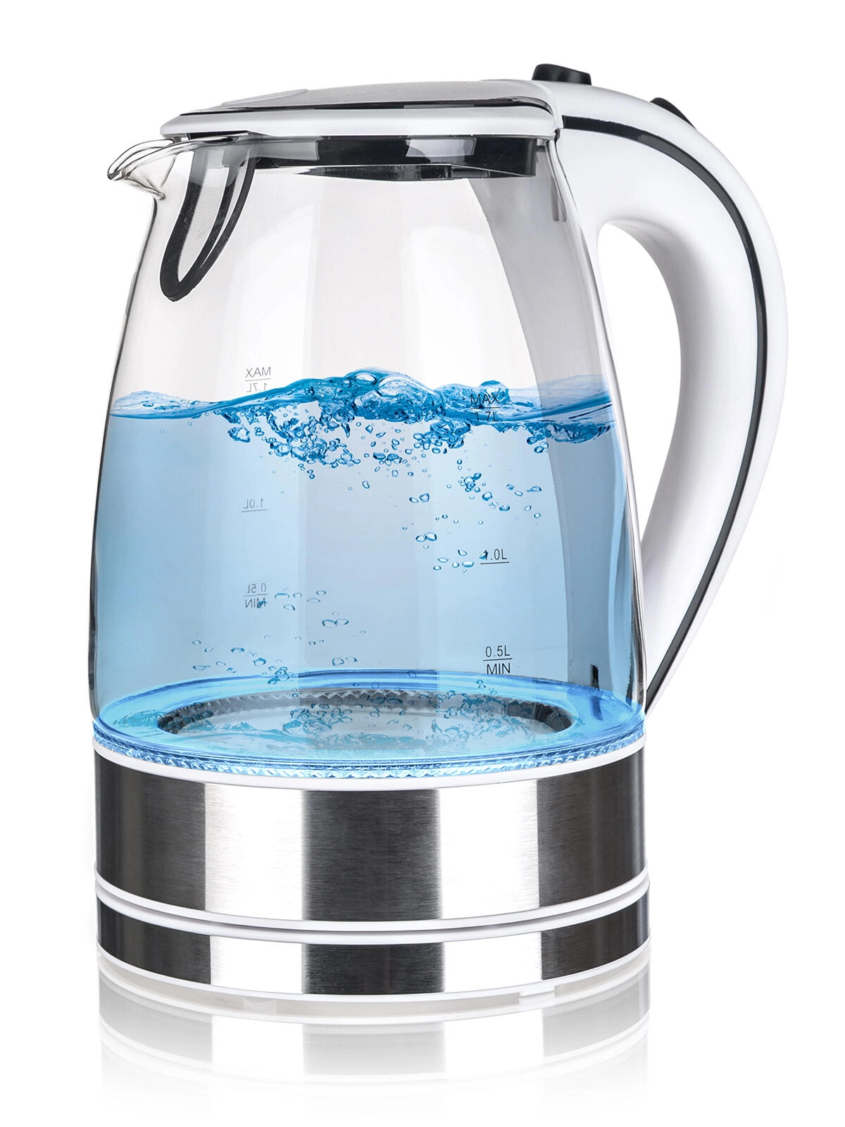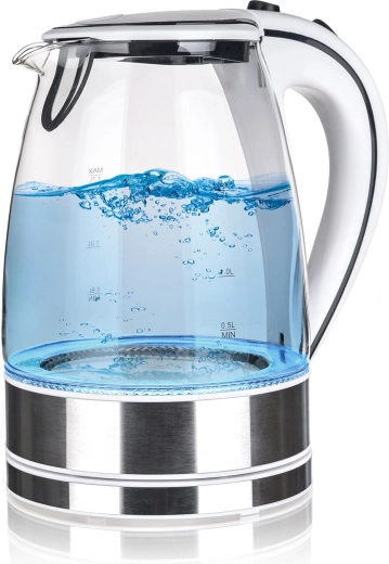 Élégante bouilloire électrique en verre BLAZE d’une capacité de 1,7 l et d’une puissance de 1850–2200 W, offrant un chauffage rapide de l’eau, un éclairage LED stylé en fonctionnement et un fonctionnement sécurisé grâce à la protection contre la surchauffe. La base rotative à 360° et le filtre amovible garantissent une utilisation pratique et un entretien facile.