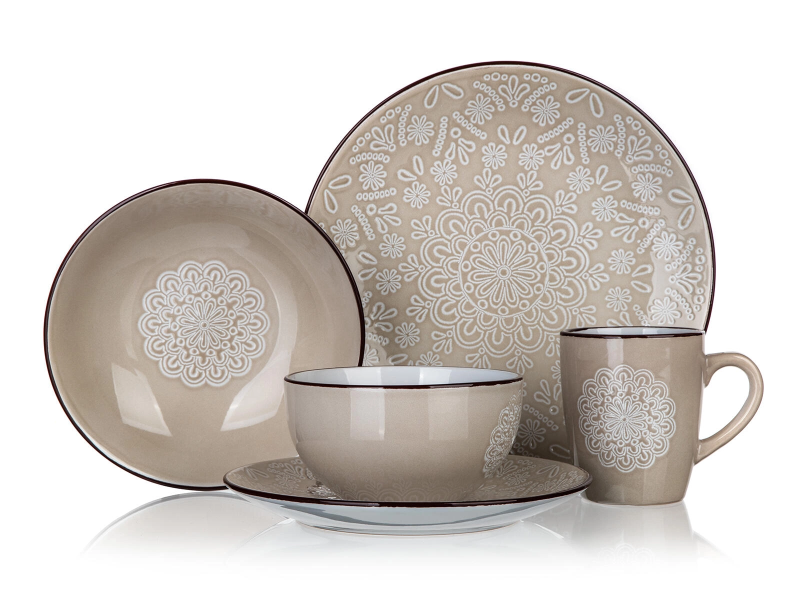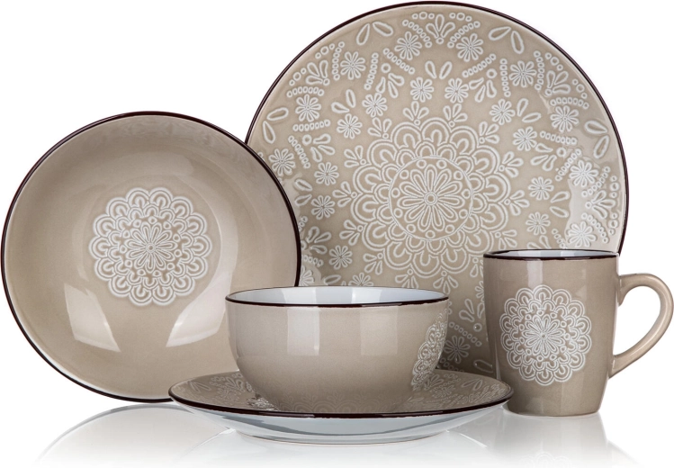 Glaçure crème avec motif mandala/dentelle blanc et liseré foncé qui sublime toute table et se marie facilement avec le reste de votre vaisselle.
