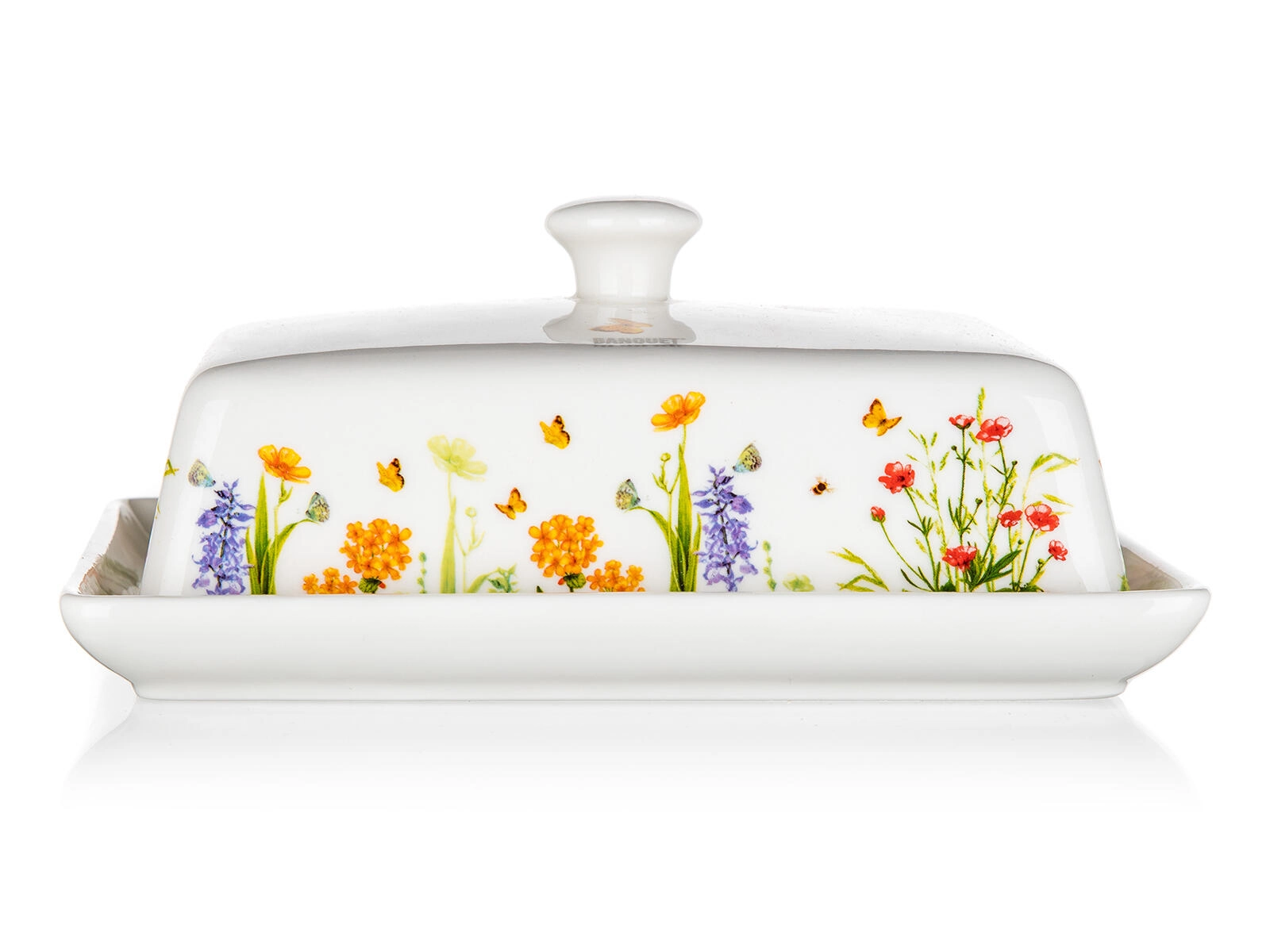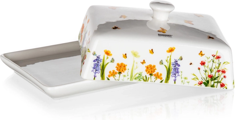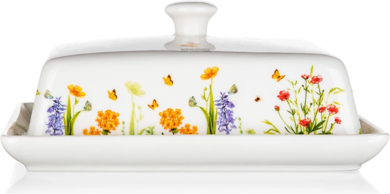 Élégant beurrier en céramique MEADOW de 17,5 cm, idéal pour conserver et servir le beurre. La finition blanche émaillée avec un délicat motif floral et de papillons embellit toute table et, grâce au couvercle pratique, garde le beurre frais et protégé. Parfait pour un usage quotidien comme pour les repas de fête.