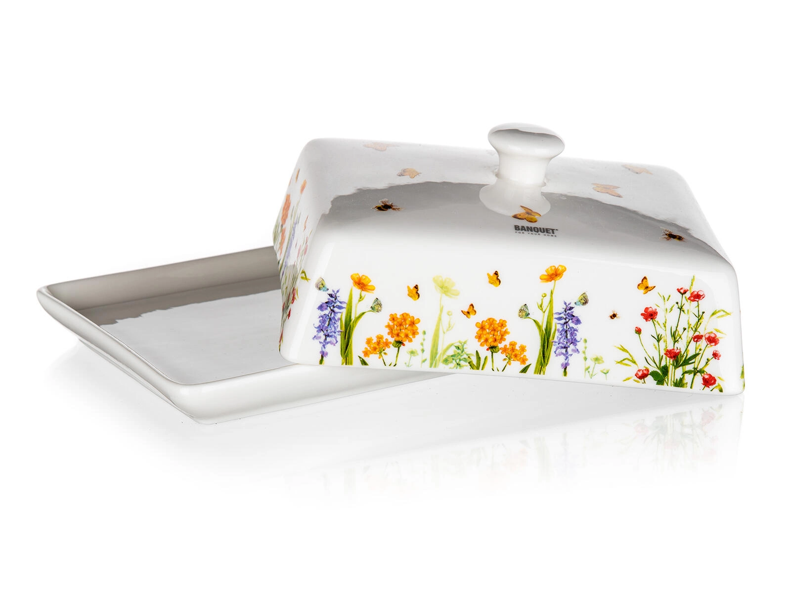Le beurrier stylé Meadow allie fonctionnalité et design. La céramique robuste avec émail lisse se nettoie aisément, le couvercle avec poignée permet un levage et un transport confortables. Le décor de fleurs et de papillons apporte à votre cuisine une touche fraîche de nature.