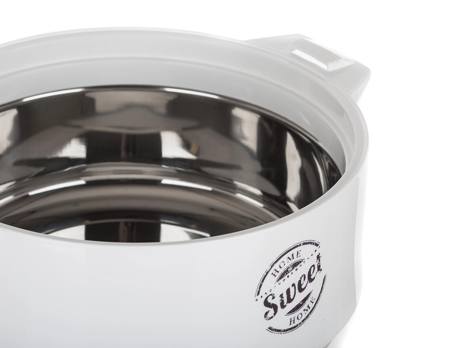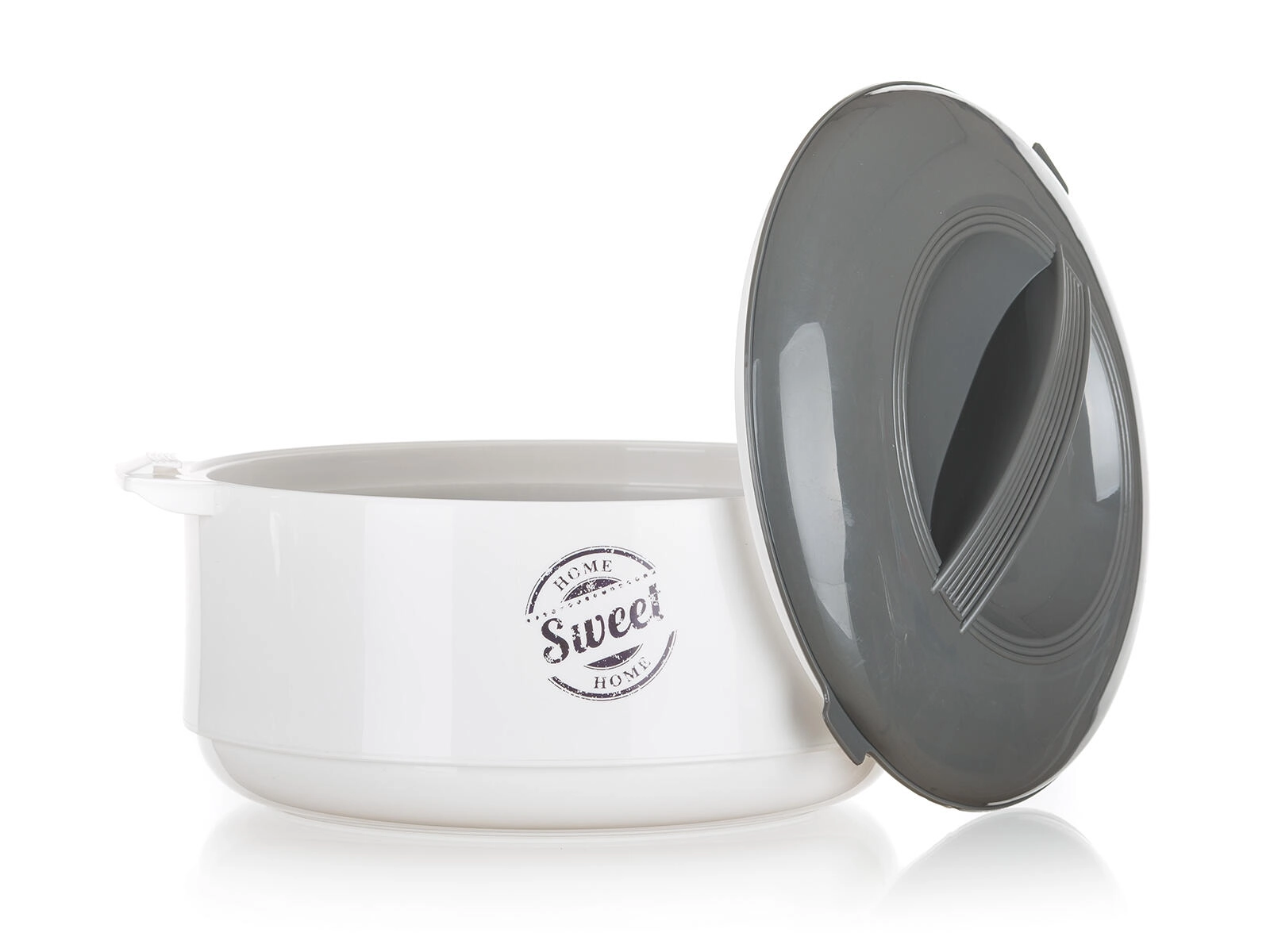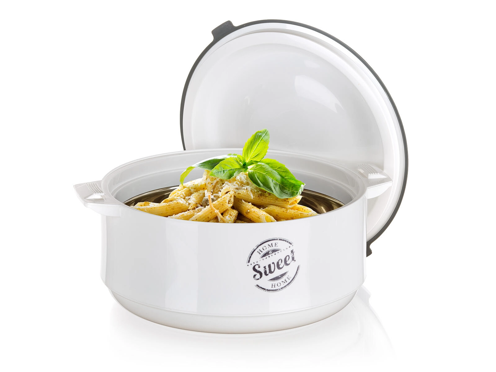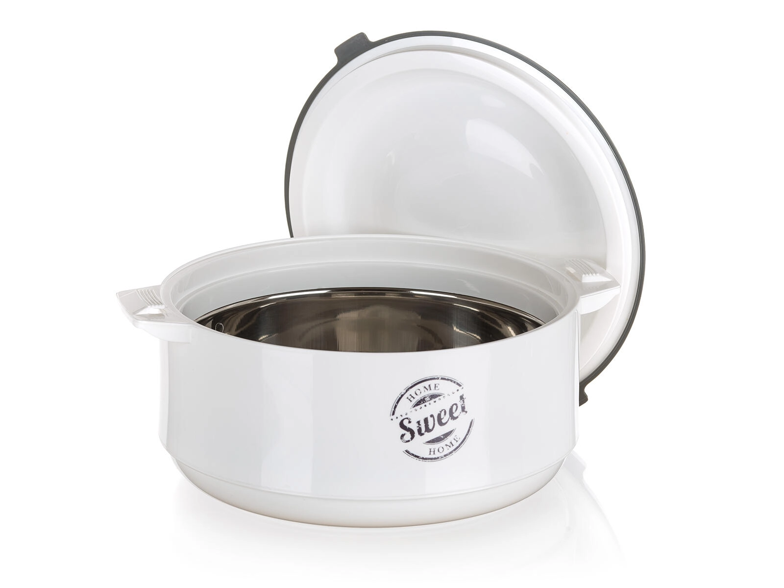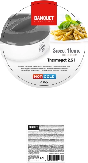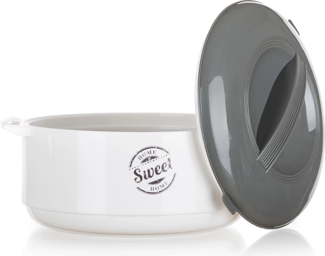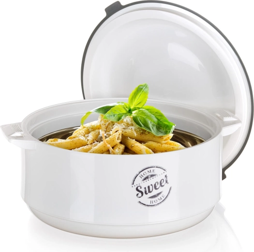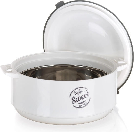 Bol isotherme pratique avec couvercle pour une conservation prolongée des plats chauds et froids. Grâce à l’insert inox et à la mousse isolante PUR, les aliments restent frais plus longtemps, idéal pour le service comme pour le transport. Élégant design blanc-gris avec motif SWEET HOME, parfait pour toute cuisine.