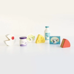 Cette caisse en bois avec produits laitiers de la marque Le Toy Van est idéale pour les enfants qui aiment jouer à la marchande ou à la cuisine. Le set comprend une bouteille de lait, du beurre, du yaourt, de la crème et trois types de fromages, chaque élément étant conçu pour sembler réaliste. Ces jouets sont non seulement amusants, mais aussi éducatifs car ils aident les enfants à comprendre l'importance d'une alimentation équilibrée.