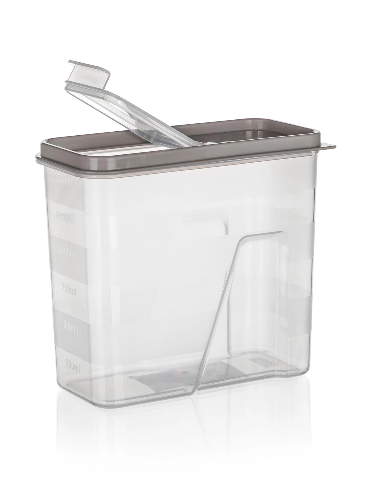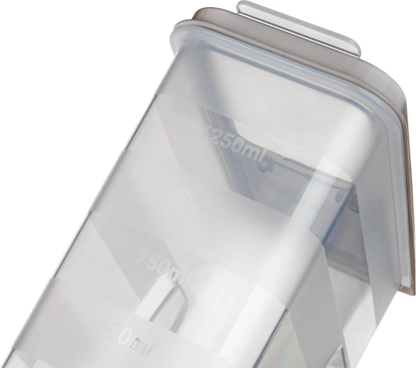 Boîte transparente pratique de 1,5 l avec couvercle élégant teinte latte pour un rangement des aliments clair et hygiénique. Grâce à la graduation intégrée et au couvercle à ouverture pratique, vous dosez et versez facilement farine, pâtes, légumineuses ou céréales. La fermeture hermétique aide à préserver la fraîcheur et les parois transparentes permettent de contrôler immédiatement le contenu.