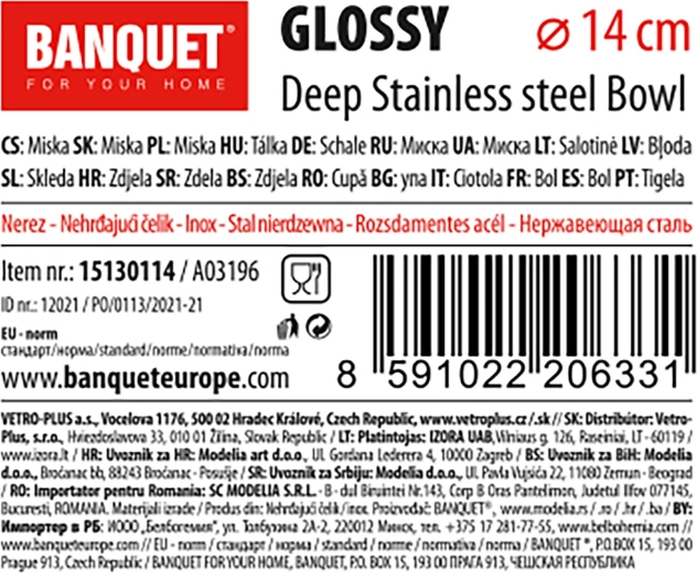 Pratique et robuste, le bol en inox Glossy de 14 cm de diamètre est idéal pour le service comme pour la préparation des plats. Grâce à sa forme profonde et à son entretien facile, il trouve sa place dans toute cuisine. Il est hygiénique, résistant et compatible avec le lave-vaisselle.