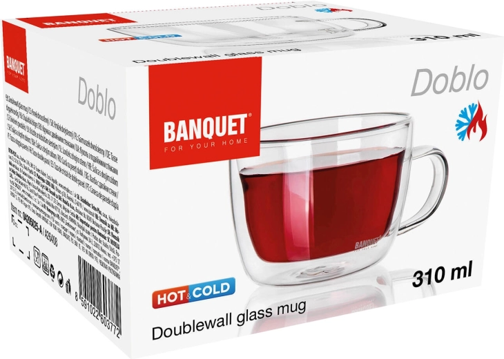 Profitez de vos boissons chaudes et froides préférées avec style. La tasse à double paroi DOBLO 310 ml est en verre transparent, qui met en valeur la couleur de la boisson et, grâce à la couche isolante, aide à maintenir une température optimale plus longtemps. Une anse confortable et une surface agréablement fraîche augmentent le confort à la dégustation.