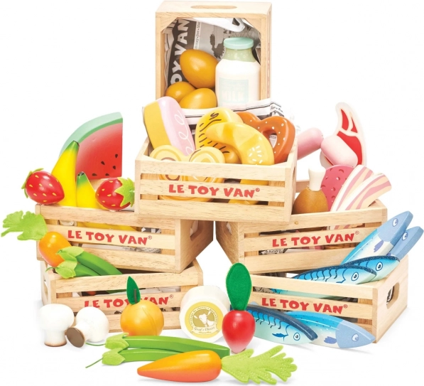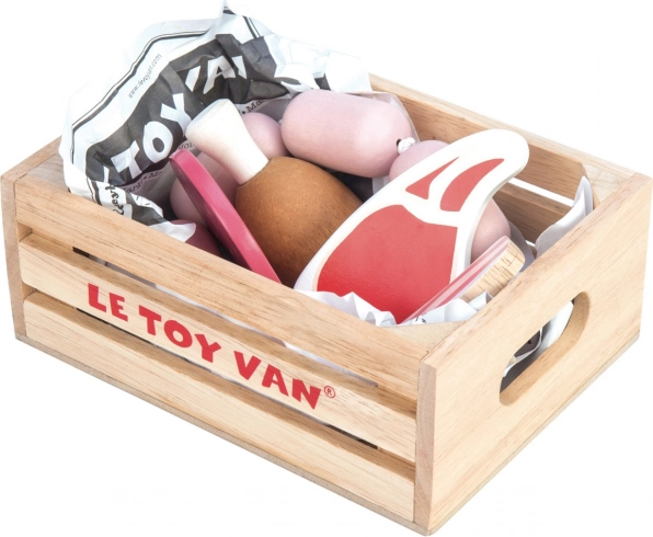 Boîte avec charcuteries de la marque Le Toy Van est idéale pour les jeux de rôle, contient des aliments traditionnels tels que saucisses, steak, poulet, salami et bacon. Fabriqué en bois durable et peintures non toxiques.