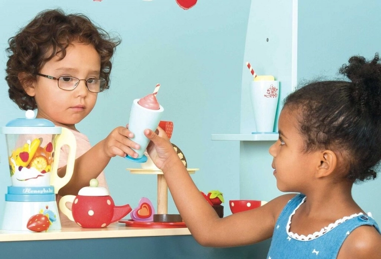 Ce set en bois stylé de la collection Honeybake transforme n’importe quelle cuisine d’enfant en bar à smoothies. Les enfants peuvent “couper” les fruits en toute sécurité grâce au velcro, remplir le bol du mixeur et servir de délicieuses boissons dans deux gobelets avec paille. Les détails réalistes encouragent les jeux de rôle, le développement de la motricité fine et des compétences cognitives.
