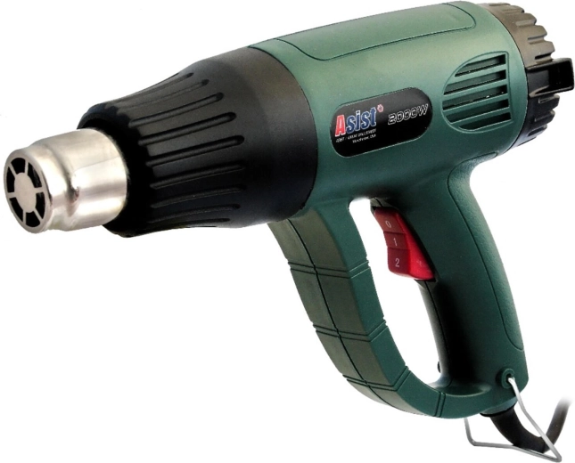 Puissant pistolet à air chaud Asist avec une puissance de 2000 W, idéal pour le formage des plastiques, le décapage des peintures et autres travaux de bricolage ou professionnels. Il offre deux modes de chauffe à des températures de 350 °C et 600 °C ainsi que deux débits d’air de 300 l/min et 500 l/min pour une adaptation précise au matériau et à la tâche.