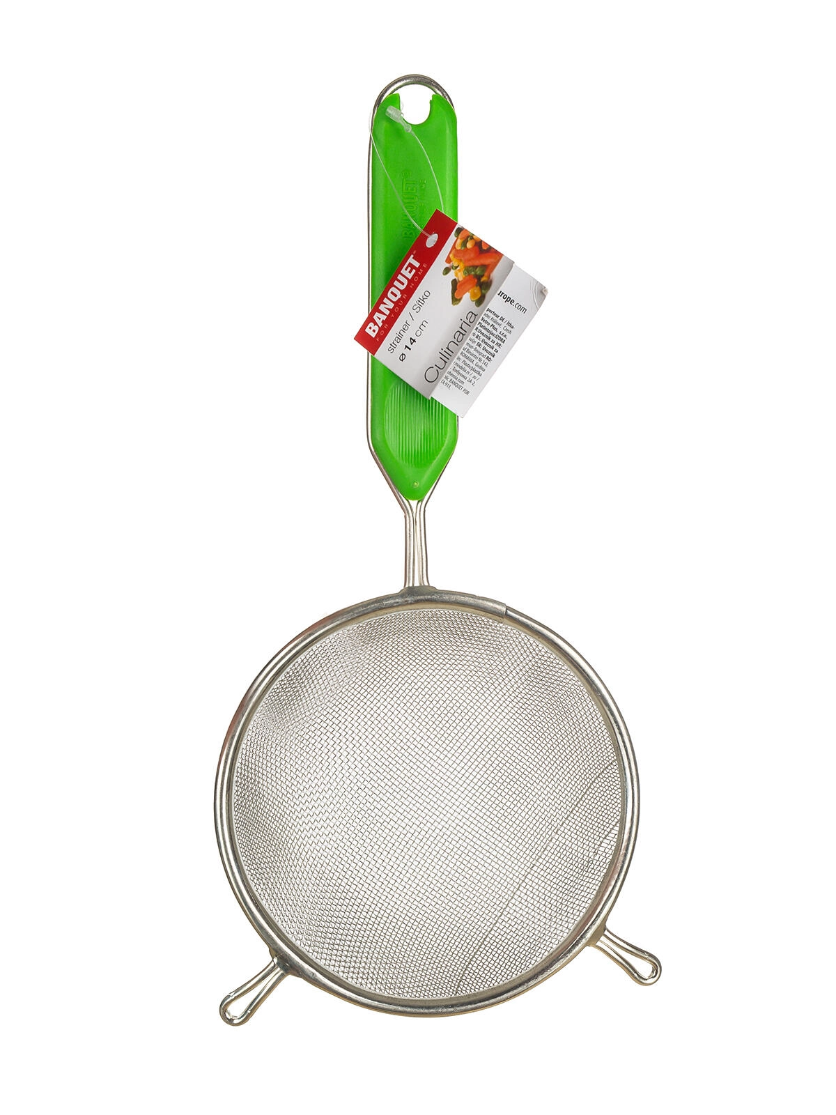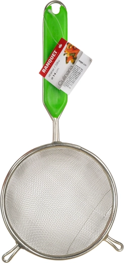Pratique passoire de cuisine de 14 cm de diamètre en métal étamé avec insertion en plastique ABS solide dans la poignée pour une prise en main confortable. Maille fine 1 × 1 mm avec une densité de 15 mailles par cm² qui retient de manière fiable même les plus petites impuretés. Idéale pour filtrer les liquides et les boissons, les sauces ou les bouillons, dans une élégante couleur verte.