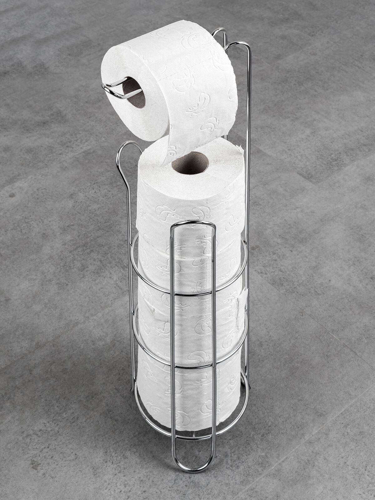 Gardez votre salle de bain ordonnée et élégante. Ce porte-papier toilette autoportant en chrome de qualité offre de la place pour plusieurs rouleaux de rechange et un déroulement pratique d’un rouleau en haut. Grâce à son profil élancé, il s’intègre aussi dans les petites salles de bain et WC.