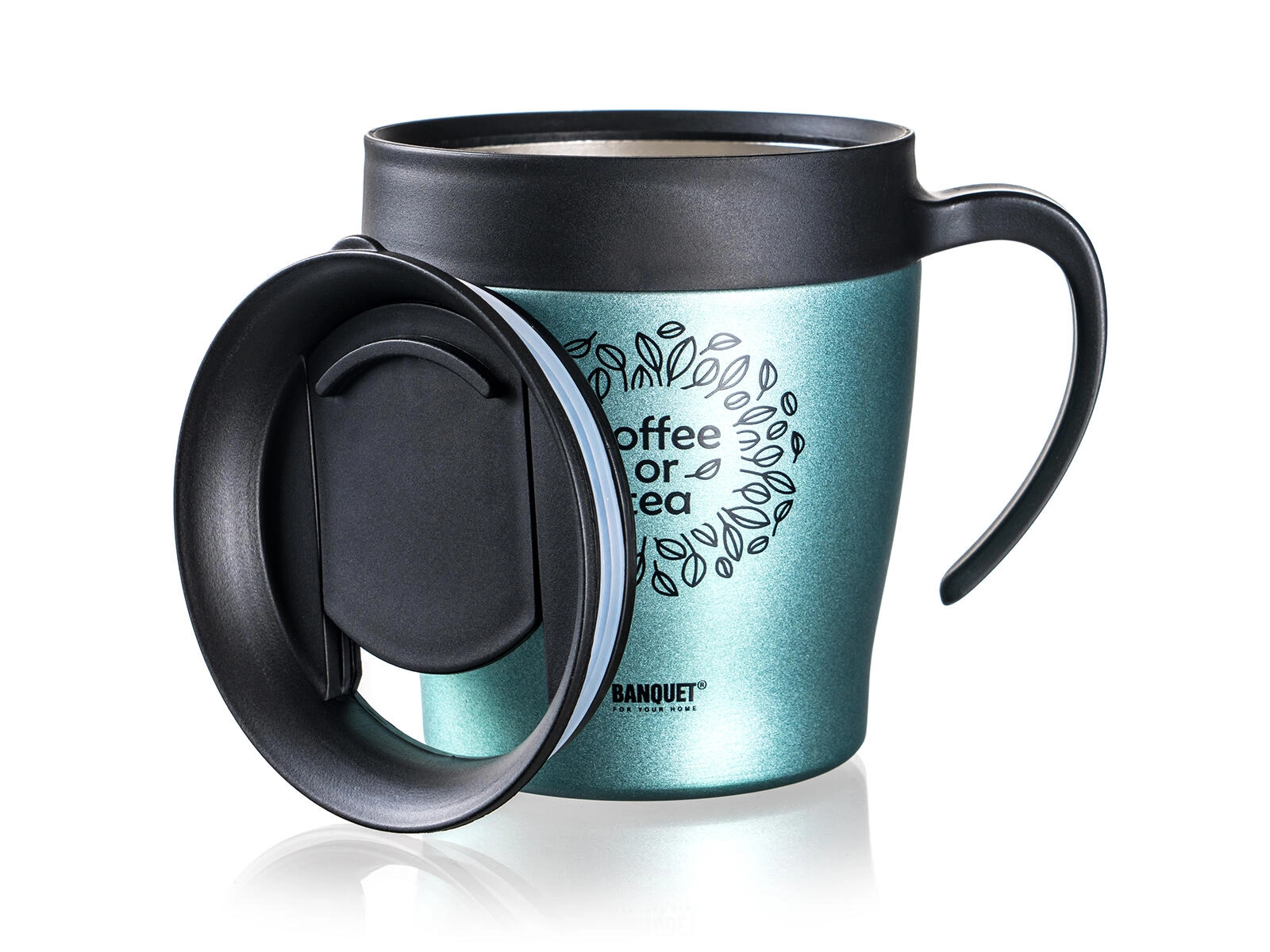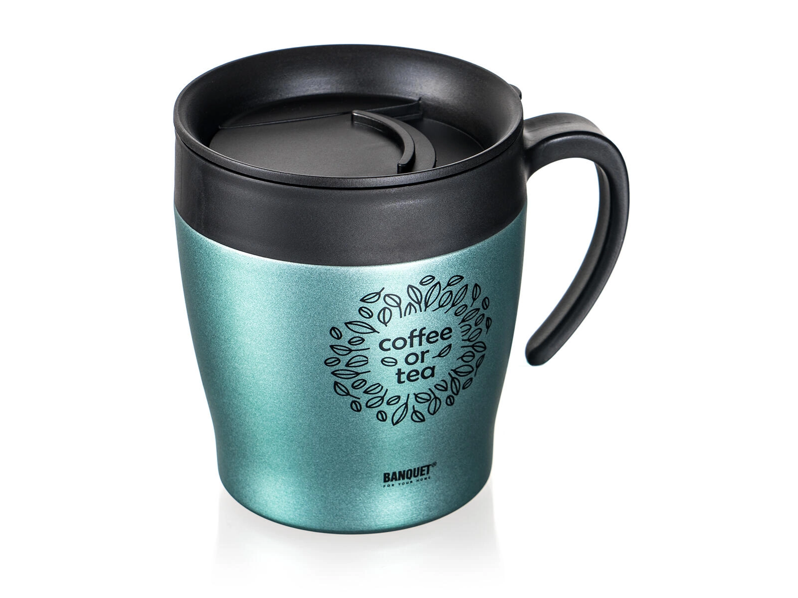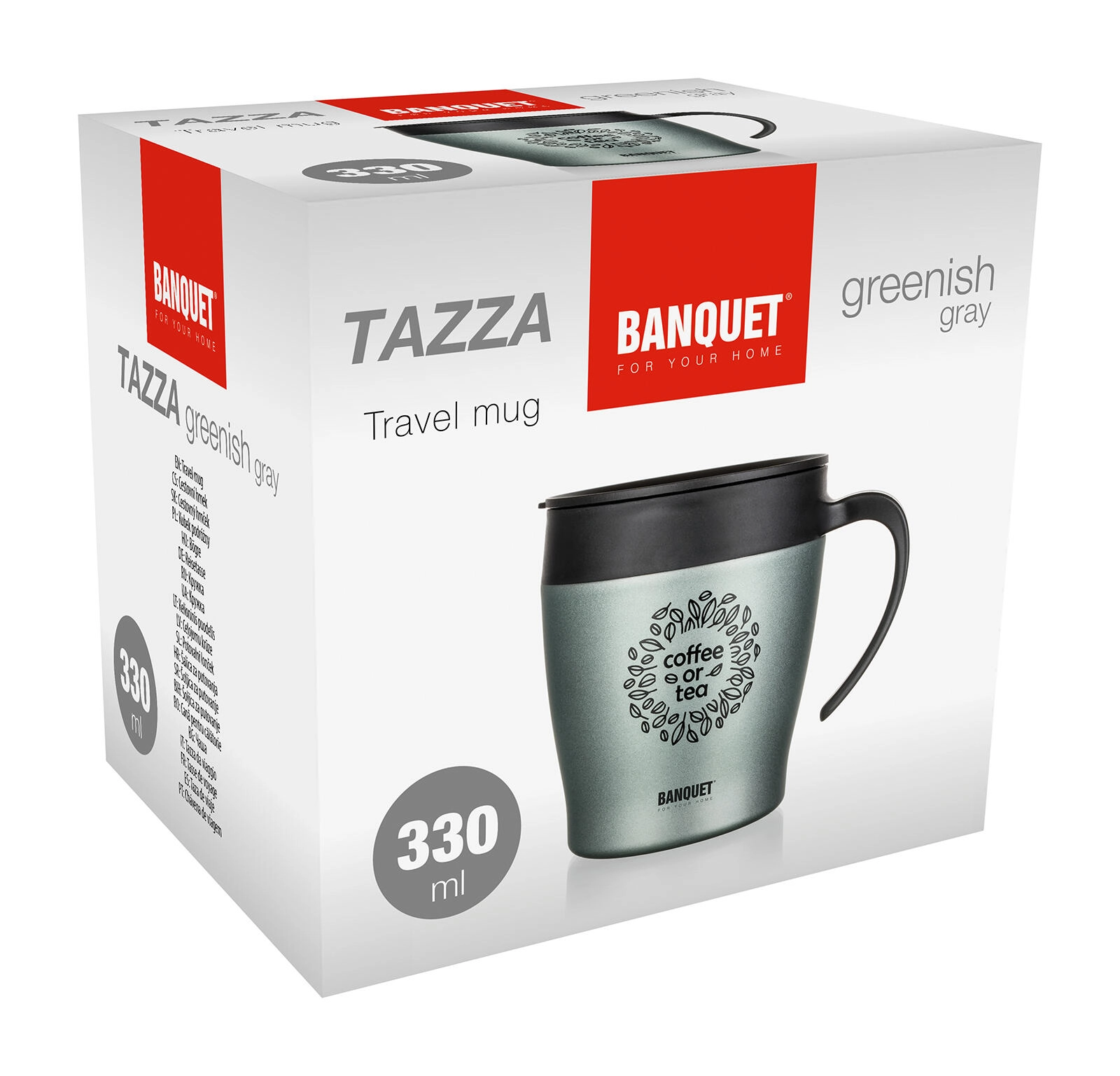 Élégant gobelet isotherme de voyage 330 ml BANQUET Tazza en métalisation vert-gris, qui maintient vos boissons chaudes ou froides plus longtemps. Il dispose d’un corps en acier inoxydable avec isolation sous vide, d’un couvercle confortable pour boire, et il est idéal pour le café ou le thé en déplacement.