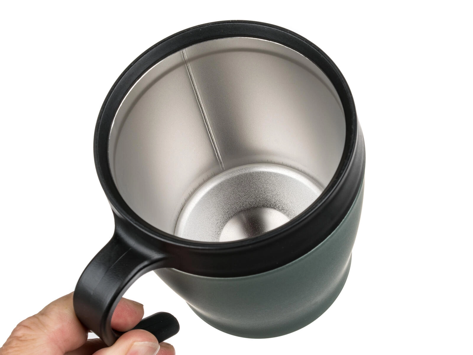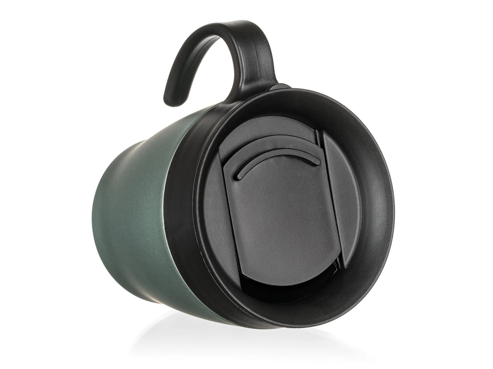 Le couvercle pratique permet de boire aisément en déplacement. Le couvercle n’est pas totalement étanche – pour une utilisation sûre, nous recommandons de conserver en position verticale. La finition métallisée vert-gris apporte une touche de style à votre rituel quotidien.