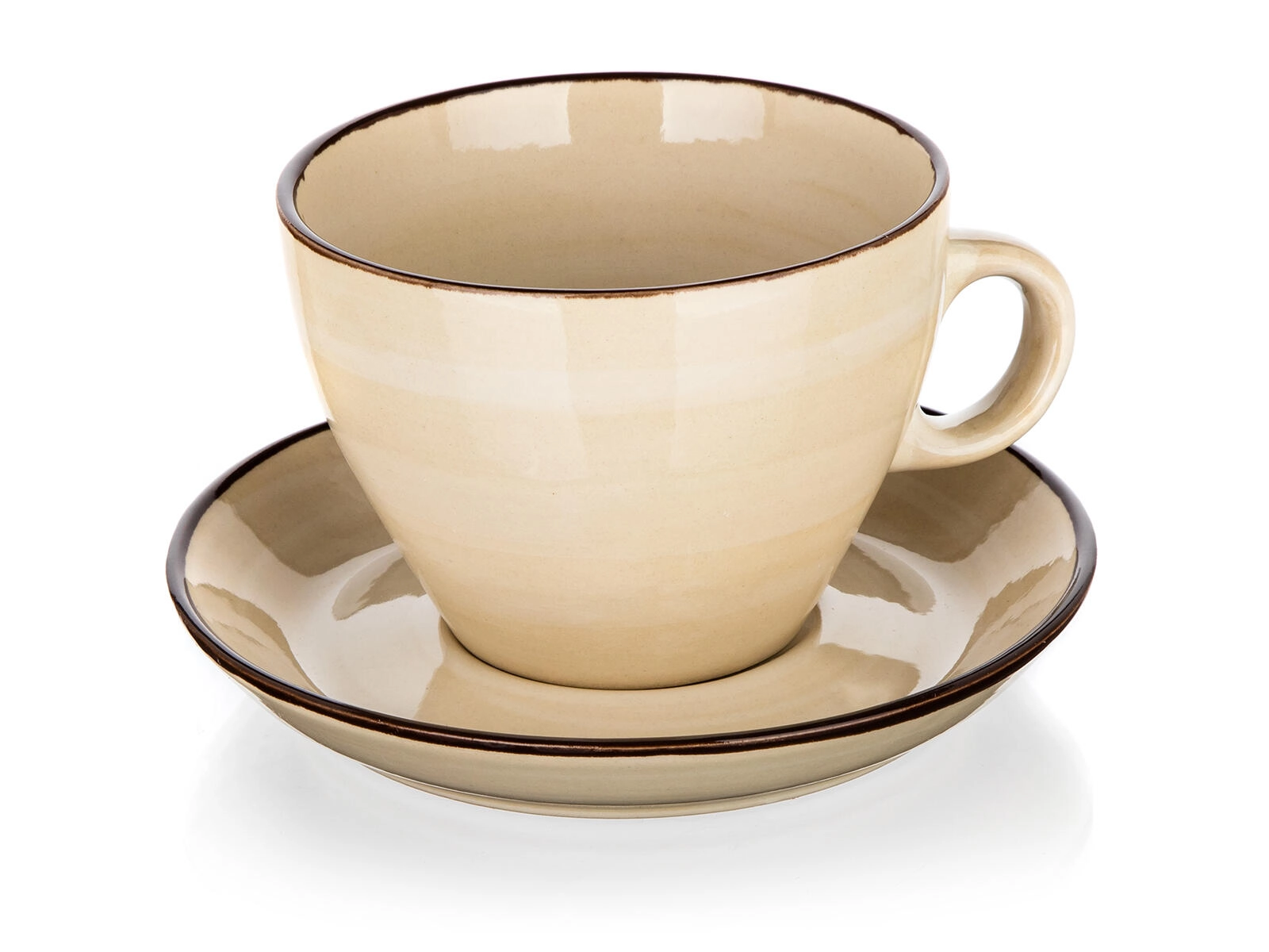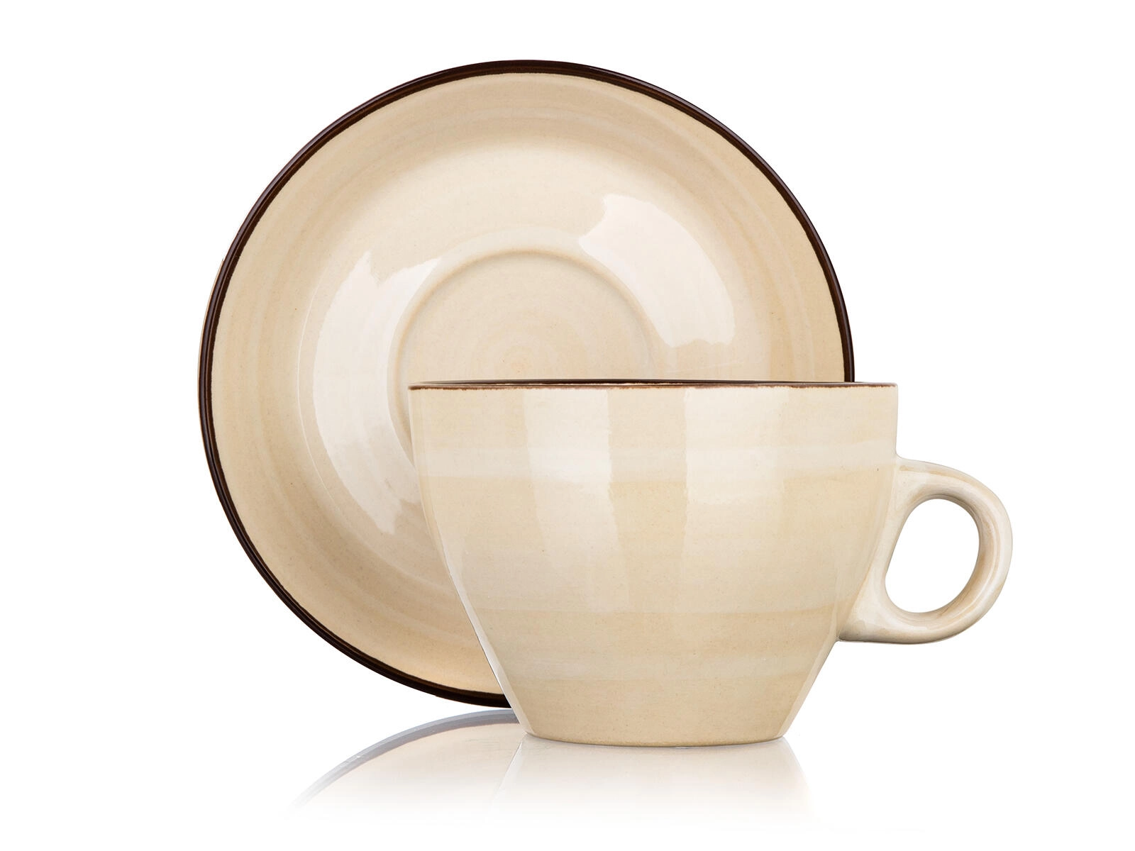 Dégustez votre boisson préférée avec style grâce à la tasse et à la soucoupe Palas en céramique. La finition crème avec bord foncé contrasté apporte une touche d’élégance à toute table et, grâce à la surface émaillée, l’ensemble se nettoie facilement et conserve longtemps son apparence.