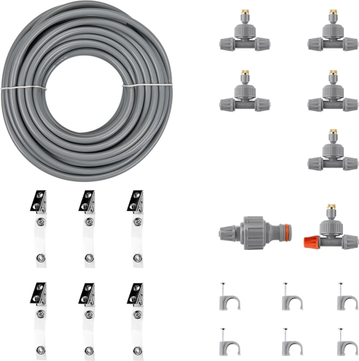 Le paquet comprend des buses en laiton robustes, y compris une buse terminale avec obturateur, des clips de montage et de suspension pour une fixation facile, ainsi qu’un filtre de protection contre les impuretés. La brume peut être orientée grâce au réglage de l’angle et les buses se nettoient facilement pour des performances constantes.