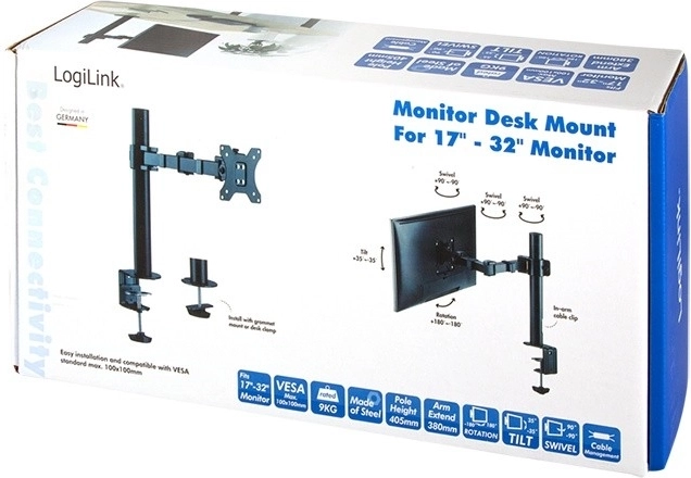 L’installation est rapide et sûre grâce à la fixation par pince sur le bord du bureau, tandis que la construction supporte jusqu’à 12 kg. L’extension du bras jusqu’à 380 mm max. offre une flexibilité idéale pour un visionnage confortable et une ergonomie optimale au travail comme en divertissement.