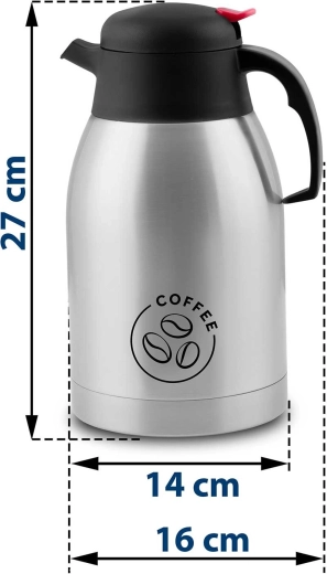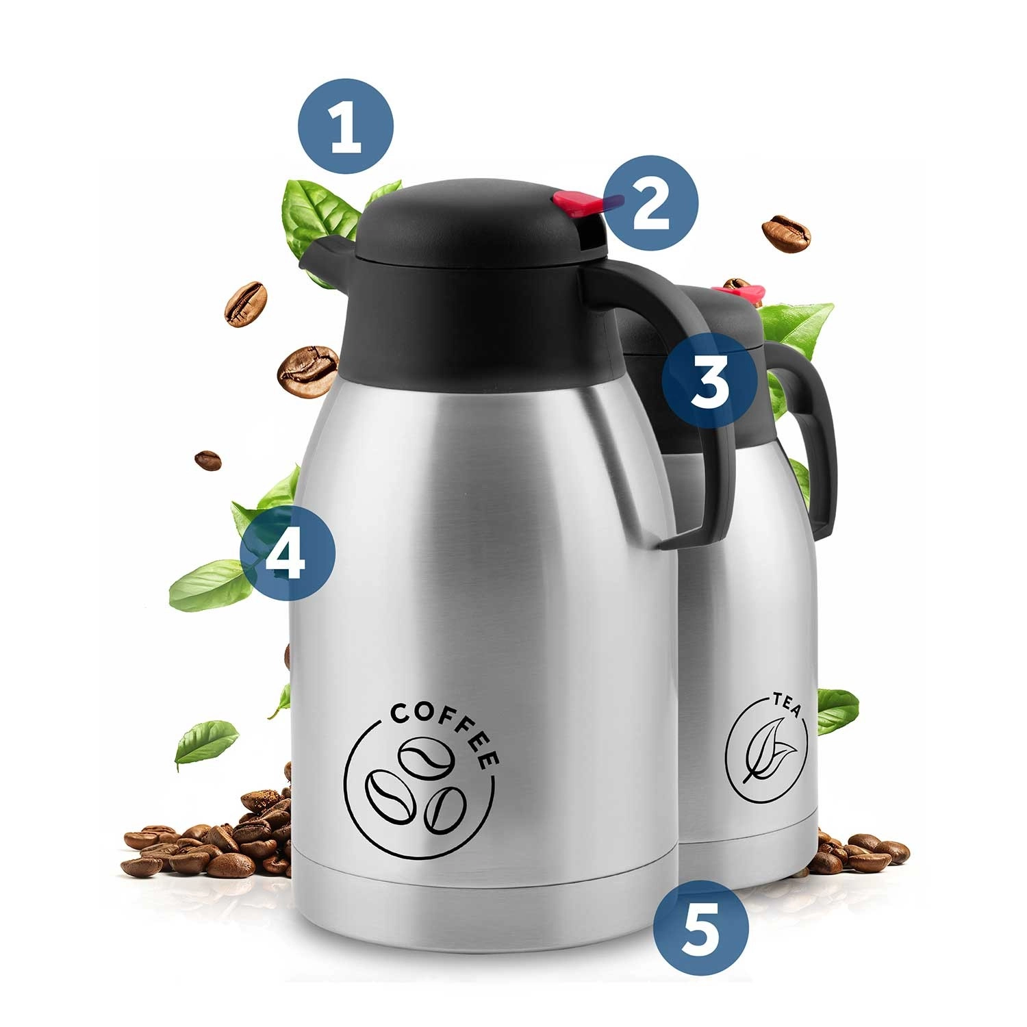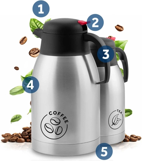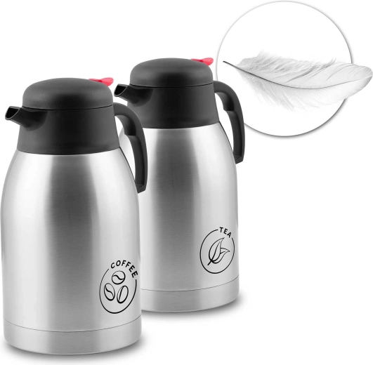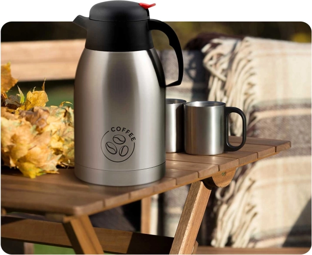 Les carafes sont légères, résistantes et conçues pour le confort : le bouton sur le couvercle permet un versement précis d’une seule main sans renverser, la fermeture étanche maintient efficacement la température et la poignée ergonomique facilite la manipulation. La surface en inox est facile à entretenir et résistante aux dommages.