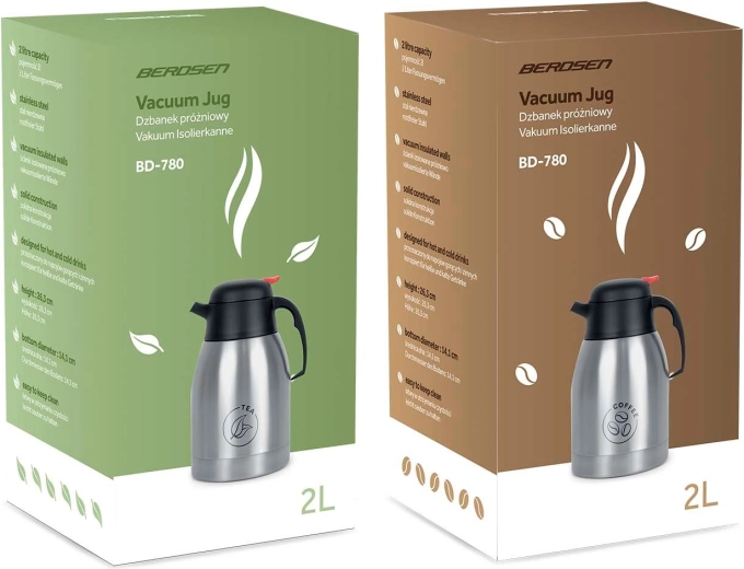 Découvrez l’ensemble fiable de 2 carafes isothermes en inox BERDSEN BD-780, d’une capacité de 2 000 ml chacune. La construction moderne à double paroi en acier inoxydable et la technologie TermoLite™ assurent une excellente isolation thermique – idéale pour les sorties familiales, les pique-niques, le bureau et les réunions à la maison. Une carafe est destinée au café, l’autre au thé, pour un service toujours bien organisé.