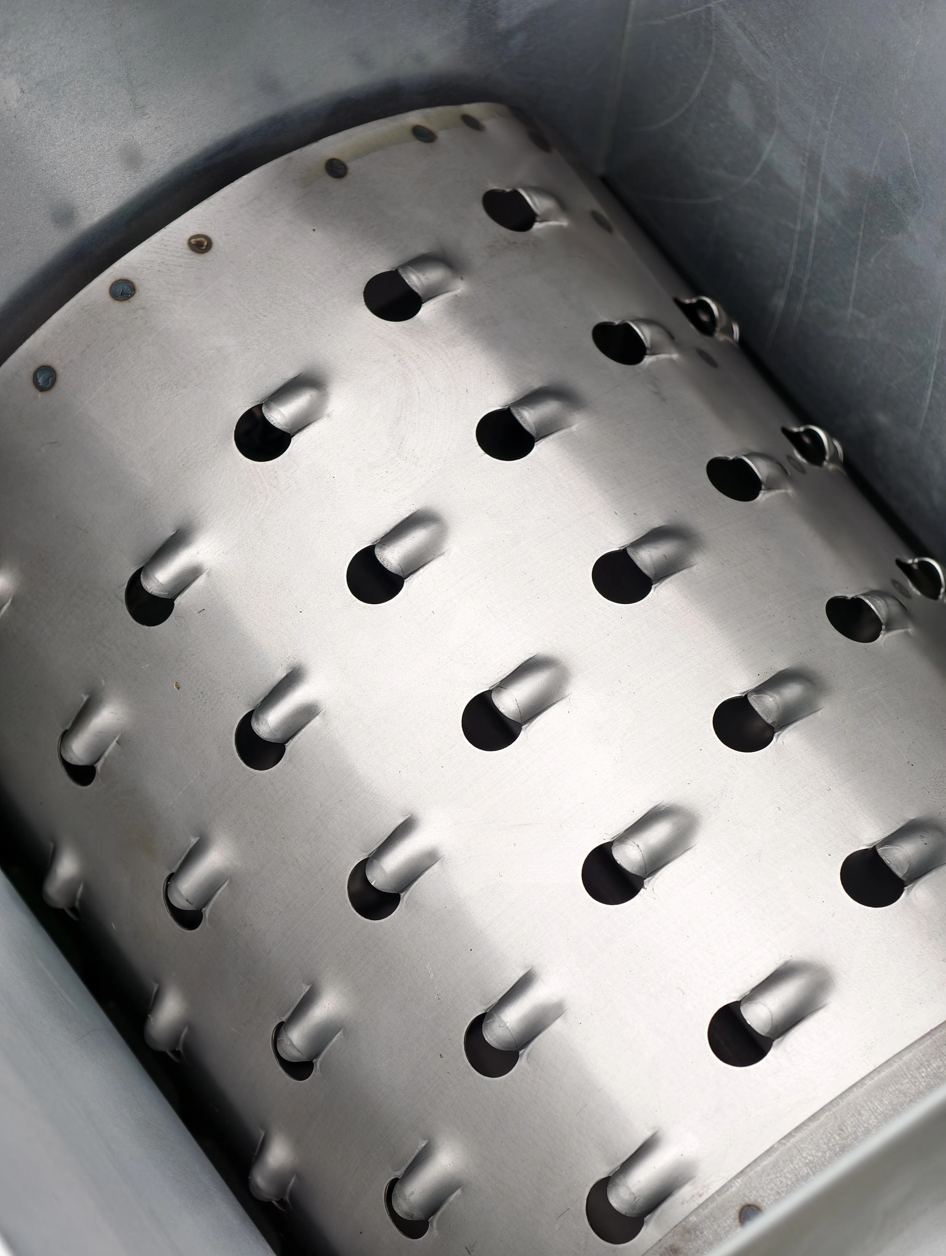 La grande trémie de 27,5 × 25,5 cm avec une profondeur de 20 cm facilite l’introduction de quantités plus importantes en une seule fois, ce qui fait gagner du temps au quotidien. Un tambour de 20 cm de diamètre est inclus et il est possible d’acheter des tambours de rechange et alternatifs pour différentes granulométries et méthodes de traitement.